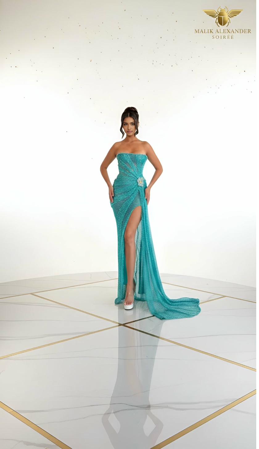 Turquoise crystal-beaded strapless gown with jeweled brooch detail at the waist. The awakening is exactly what this gown delivers — the moment a young woman steps into her power and the room takes notice. The turquoise crystal work catches light unlike any other shade in the collection.