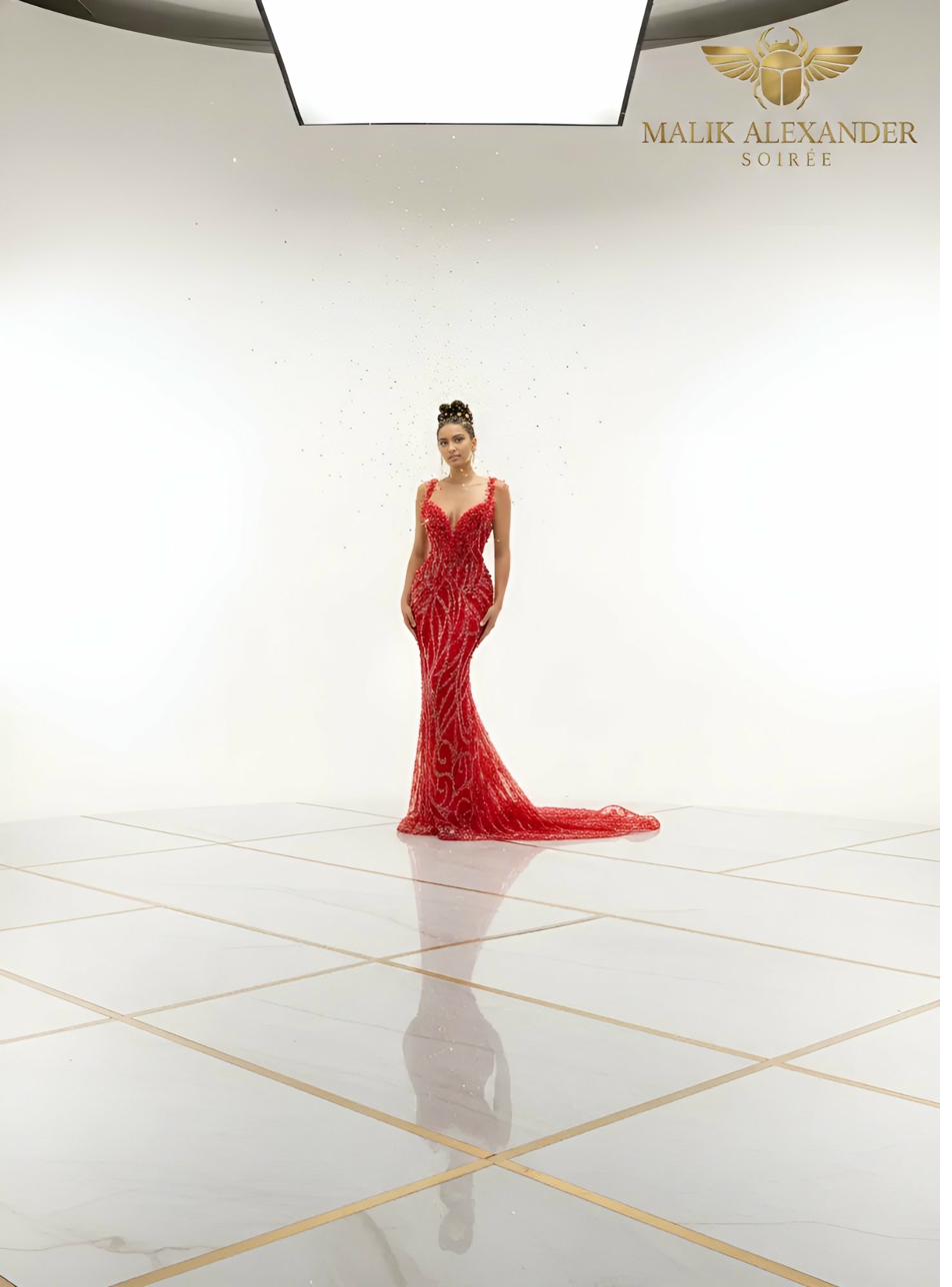 Red sequin V-neck mermaid with 3D floral and lace appliqué.