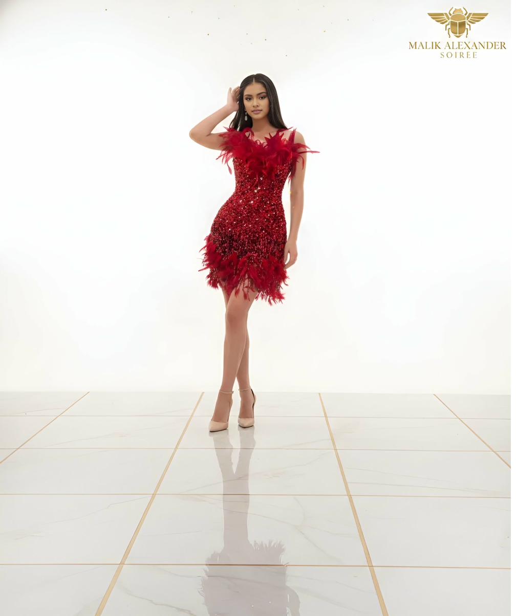 Red sequin and feathered mini cocktail dress with dramatic feather trim at hem and shoulders. Grace is not quiet — it is the confidence to wear feathers and sequins at the same time and make it look inevitable.