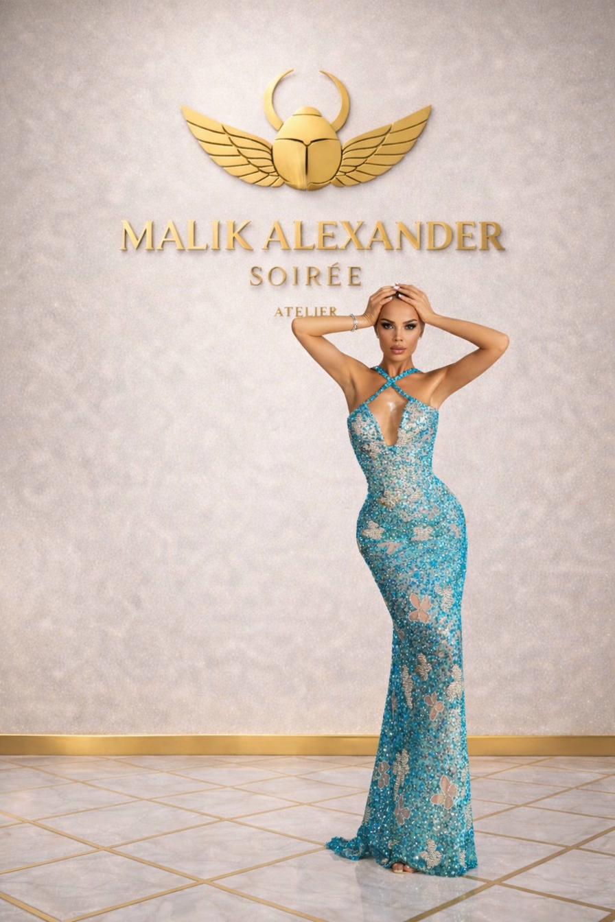 Turquoise aqua halter sequin gown with gold floral appliqués. Paradise is a state of mind — and this turquoise and gold combination creates exactly that visual warmth and joy.
