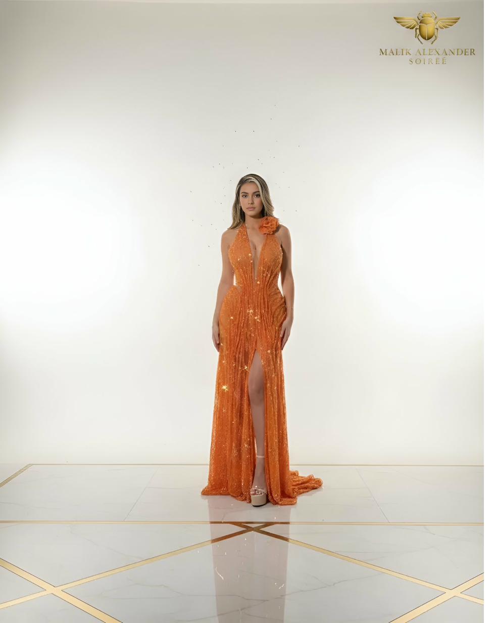 Orange sequin halter gown with 3D rose shoulder and dramatic train.