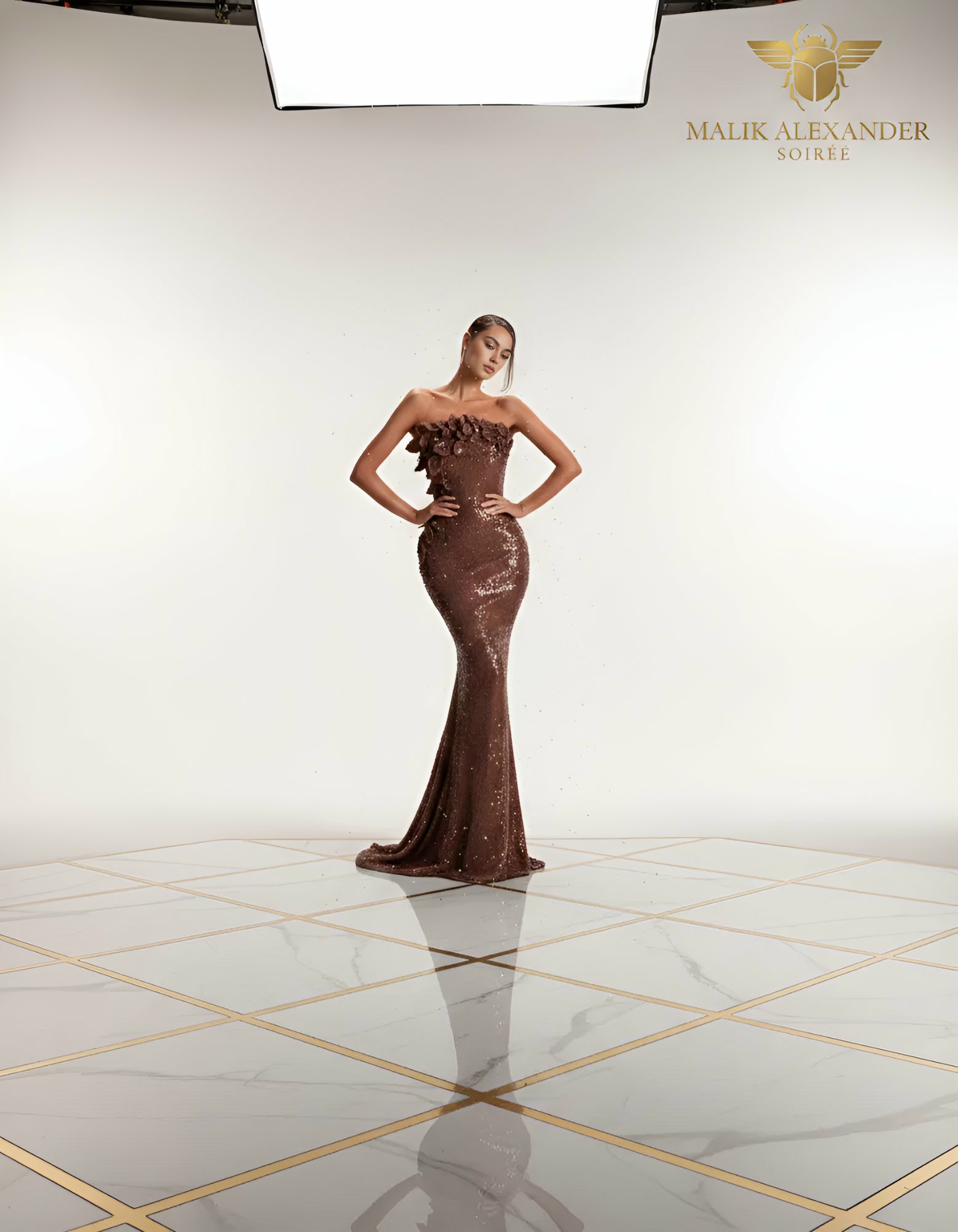 Chocolate brown strapless sequin mermaid with 3D floral petals.