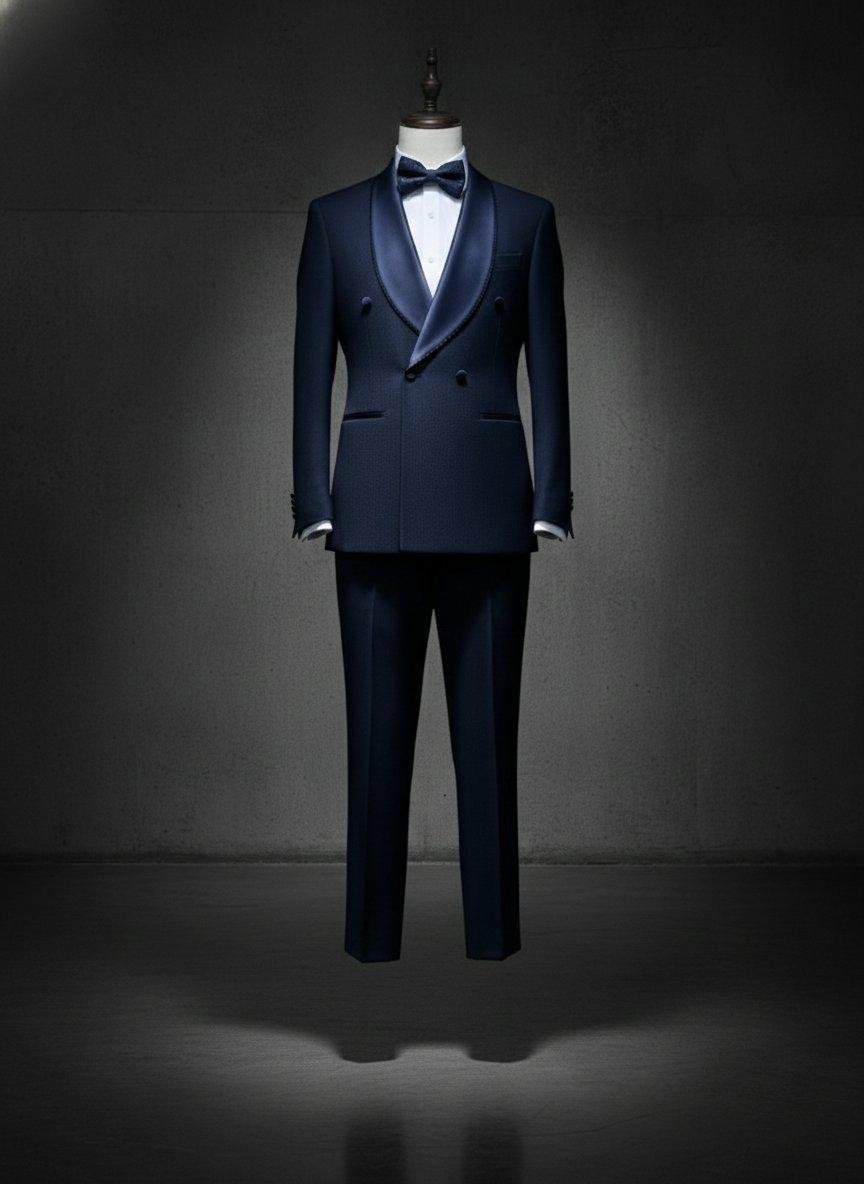 Navy double-breasted tuxedo with clean satin peak lapels. The navy fabric carries a refined sheen that separates it from everyday blue. Satin-covered buttons and satin pocket welts add formal finishing. Slim-cut trousers, matching bow tie, white dress shirt.