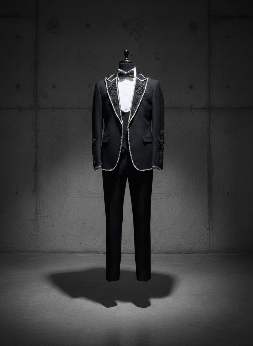Black single-breasted tuxedo with pearl lapel trim and crystal shoulder appliqués. Pearl beading traces the shawl lapels while crystal floral appliqués sit at both shoulder points. Black trousers, crystal bow tie, white dress shirt.