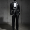 DRIZZLE combines two luxury materials — crystal and pearl — with chain elements that add movement and dimension. The pearl scatter creates warm, soft light while the crystals add sharp sparkle, giving the suit two different glow qualities in one. The chain drip accents add subtle movement when he walks. For parents, the pearl element reads as classic and refined. For his peers, the crystal and chain combination reads as current and fashion-forward. The double-breasted silhouette keeps the overall look structured and formal.