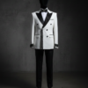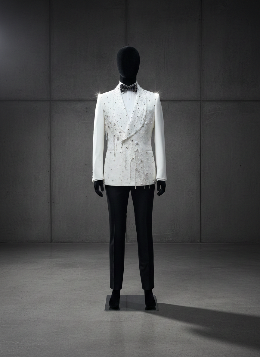 White double-breasted tuxedo with crystal and pearl scatter across the jacket, plus chain drip accents from the shoulder area. Small pearls and crystals are scattered across the white fabric with thin chain elements that create a dripping effect. Black trousers, crystal bow tie, white dress shirt.