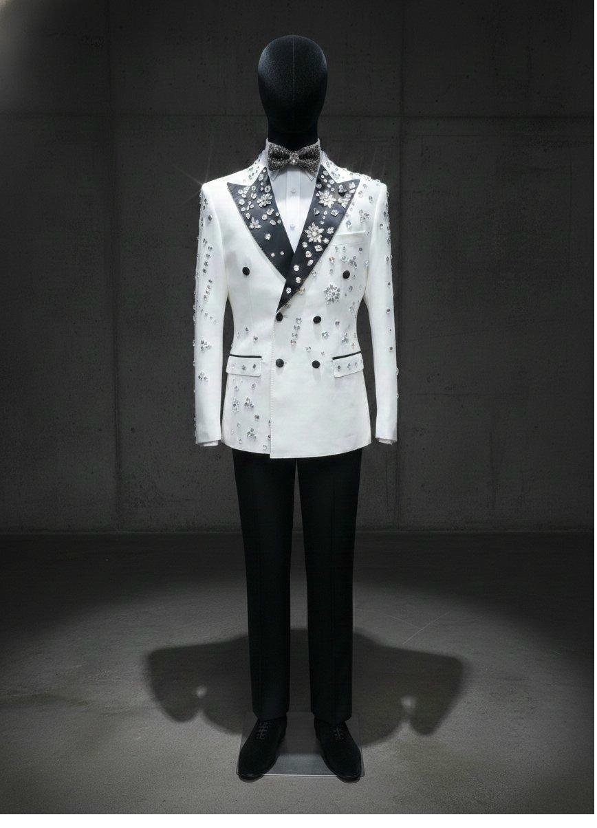 • White double-breasted tuxedo jacket with full crystal starburst coverage