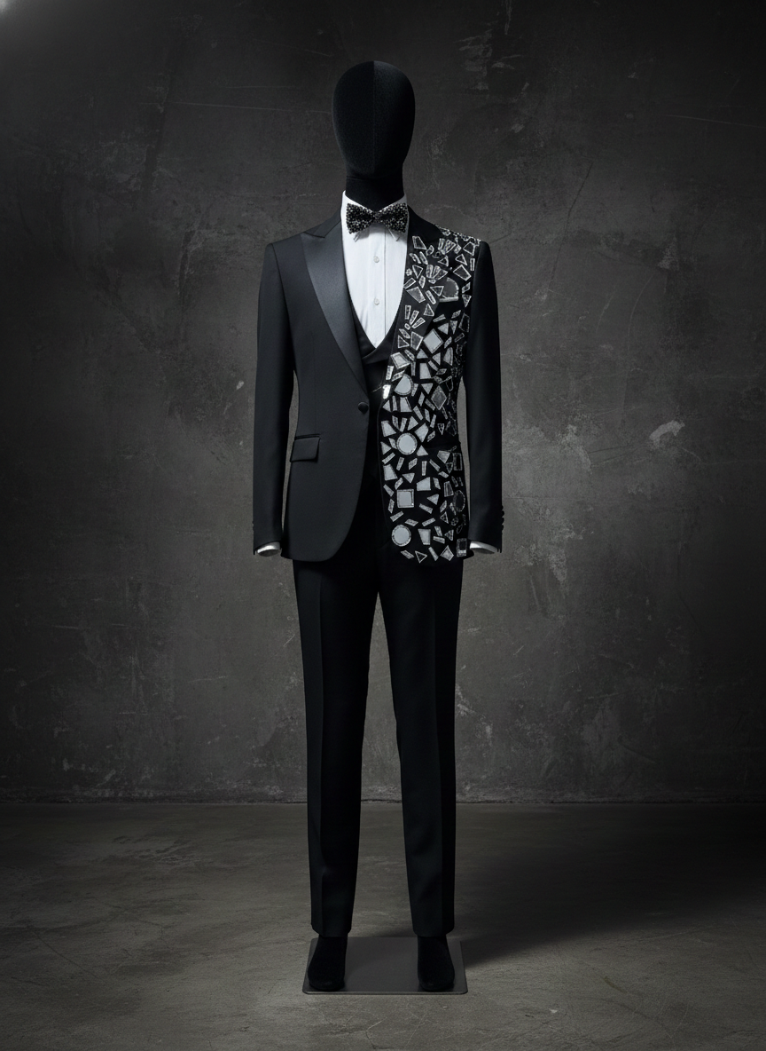 Black single-breasted tuxedo with geometric mirror mosaic panel on the left front. Mirrored crystal fragments are arranged in angular geometric shapes, creating a mosaic effect that reflects light in multiple directions. The right side stays clean. Black trousers, crystal bow tie, white dress shirt.