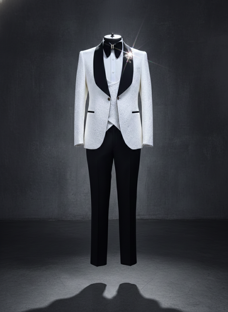 White jacquard three-piece tuxedo with matching vest and satin shawl collar. The full three-piece includes a tailored vest that adds structure and formality. Subtle jacquard weave throughout. Black trousers, bow tie, white dress shirt.