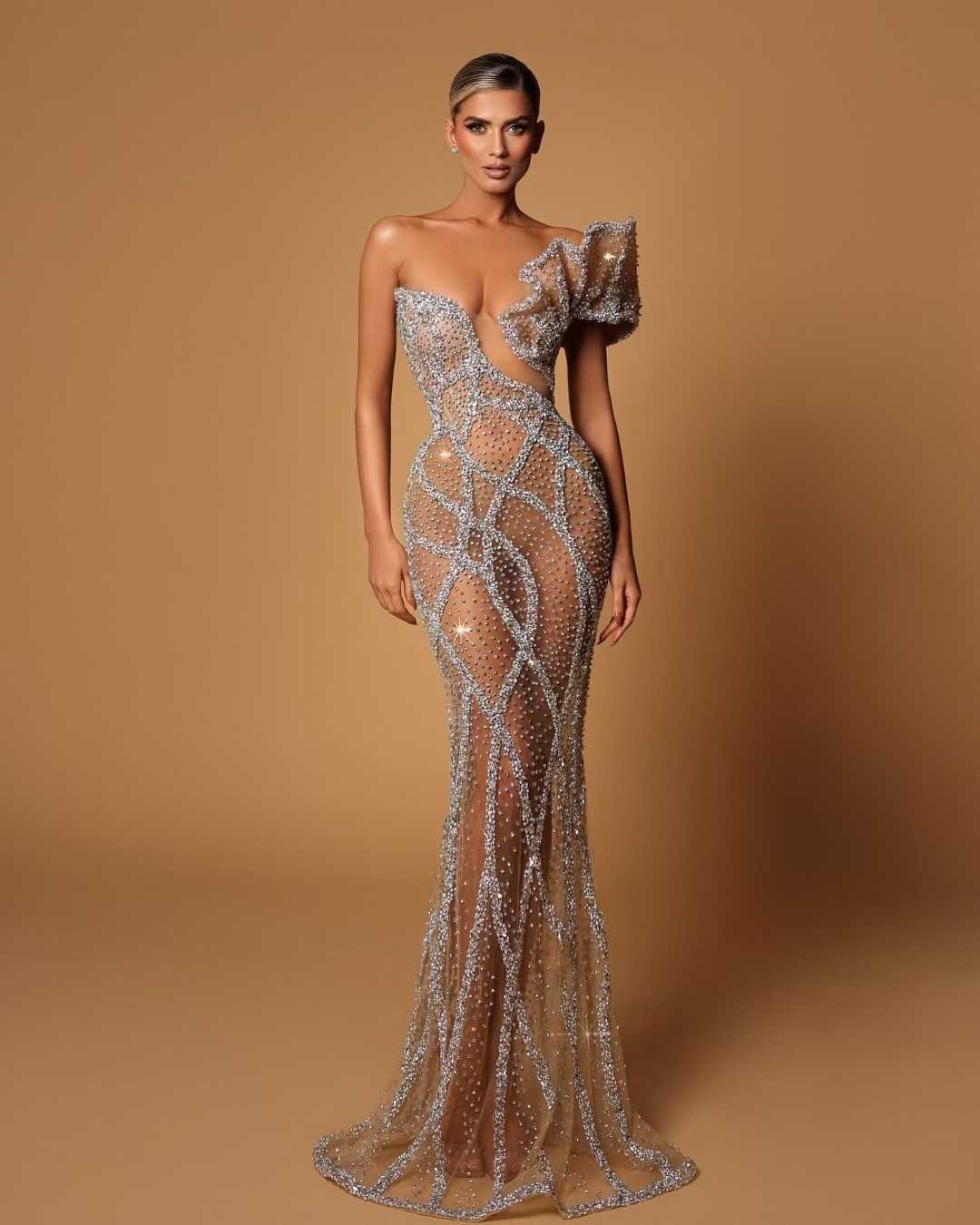 Sheer nude mesh gown adorned with silver geometric crystal beading and sculptural one-shoulder puff detail.