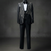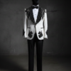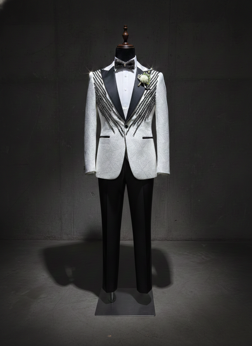 RANK borrows from military formal dress — the shoulder chain fringe evokes the decorations worn by officers at state dinners and formal ceremonies. For parents, this reference reads as DISTINGUISHED rather than rebellious. The geometric fabric texture adds depth and interest to the white base while the black crystal chains add movement and formality to the shoulder line. Under venue lights, the chain fringe catches light in cascading waves as he moves. This is the suit that makes people ask “who is THAT” — not because it’s loud, but because it carries authority.