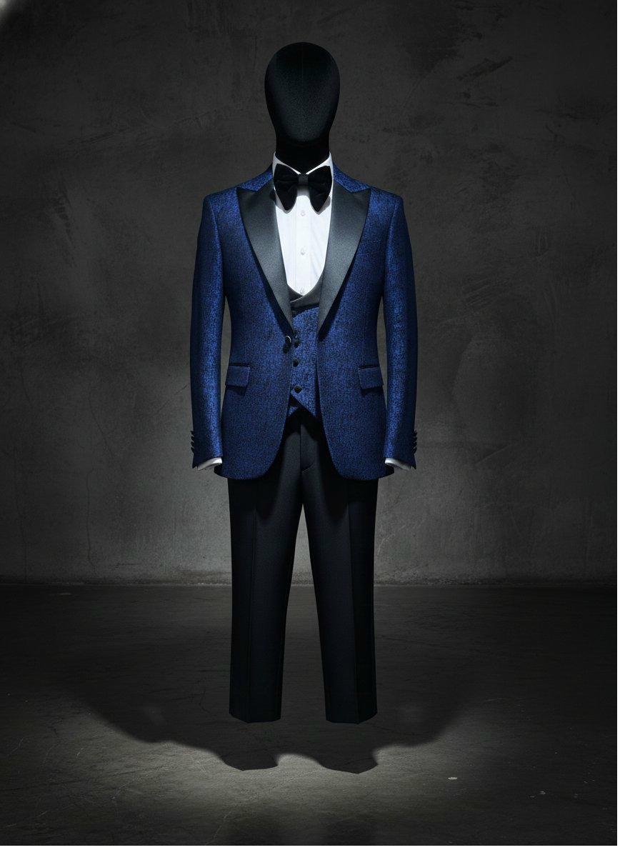 Royal blue three-piece tuxedo with clean satin shawl lapels. The blue is vivid and rich — a true royal shade that photographs beautifully. Matching blue vest and bow tie. The satin shawl lapels add formal polish. Black trousers, white dress shirt.