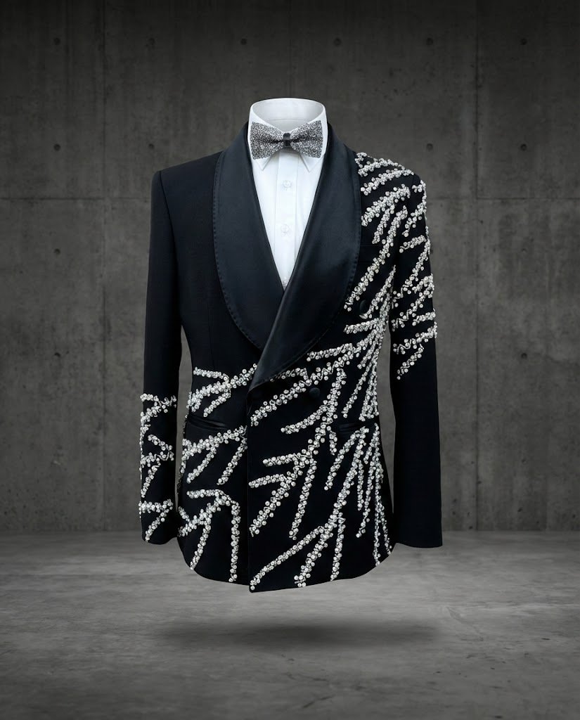 Unleash your presence with the Savage Dynasty Tuxedo Set, designed for men who don’t enter a room quietly. This bold black tuxedo features silver crystal embellishments arranged in fierce tiger stripe patterns across an asymmetric layout, delivering raw power and untamed style.