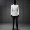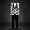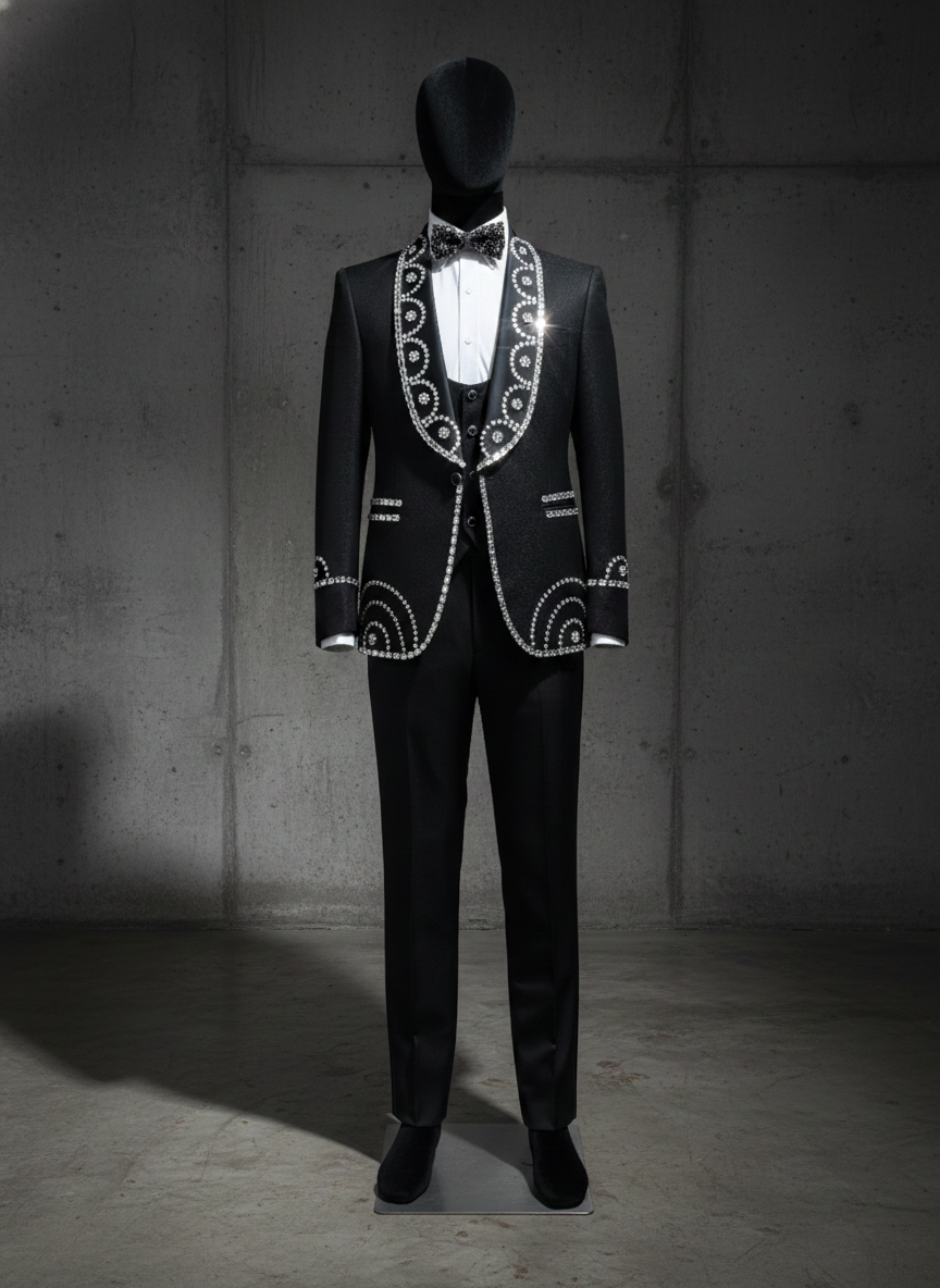 SCROLL borrows from architecture and fine art — the scrollwork patterns look like the iron gates of a grand estate or the borders of an illuminated manuscript. Parents recognize this as classical artistry, not costume flash. The three-piece construction adds depth, with the vest carrying its own scroll detail that’s visible when the jacket is open. The silver crystal on black creates a refined contrast that photographs sharply. Under venue lights, the scroll patterns trace luminous borders around his silhouette, creating an ornate frame around his entire presence.