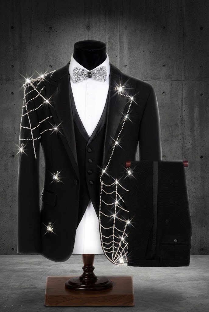 The Structure True to its name, this suit features an architectural silhouette. The velvet shawl lapel is heavily encrusted with dark, metallic beadwork that mimics the organic geometry of a web, extending to the shoulders to create a broad, commanding frame. It’s a look that says you don’t just inhabit the space—you designed it.