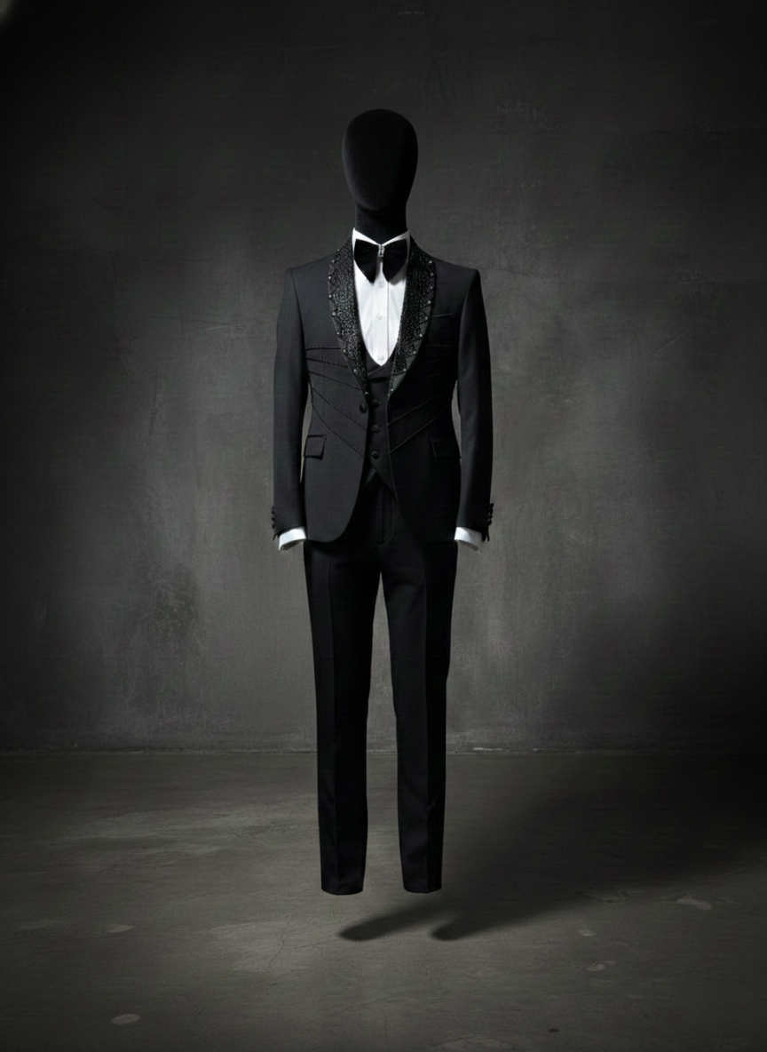 Black three-piece tuxedo with subtle beaded shawl lapel in tone-on-tone black. The lapel beading is black on black — visible up close but understated from a distance. Matching black vest. Black trousers, bow tie, white dress shirt.