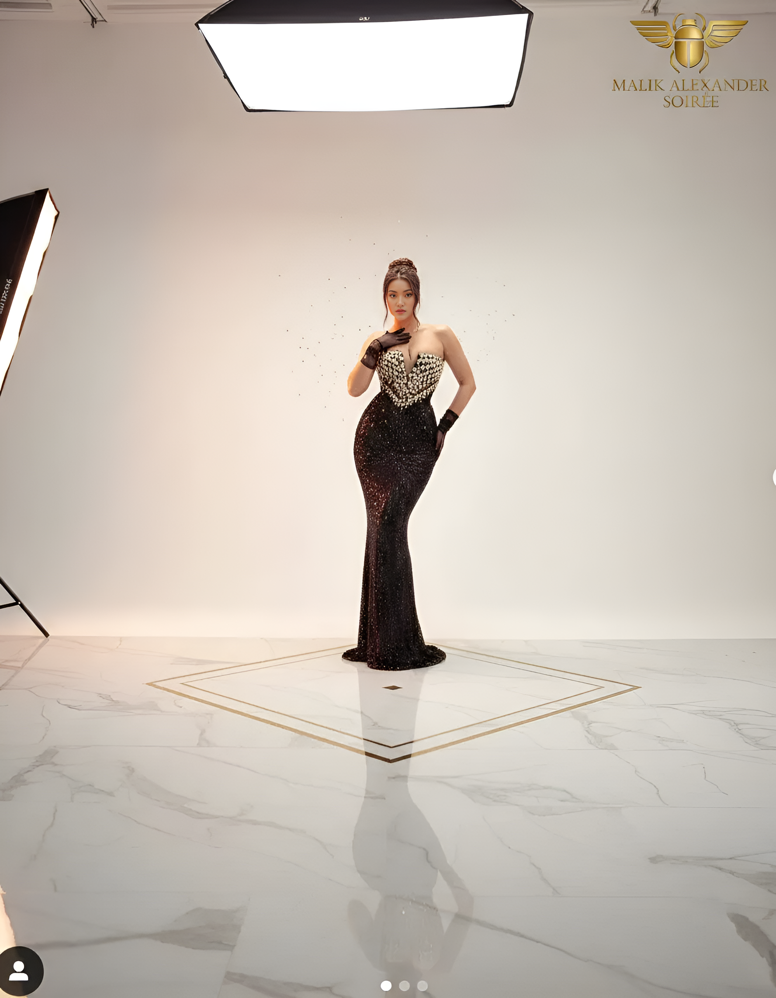 Black strapless mermaid with pearl and crystal diamond bust, opera gloves, and micro-sequin body