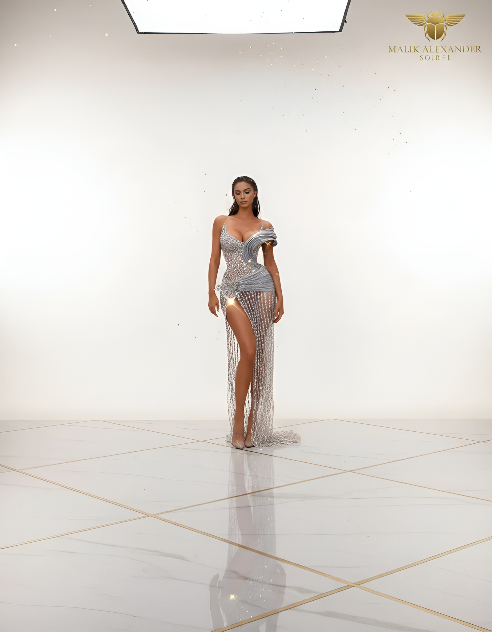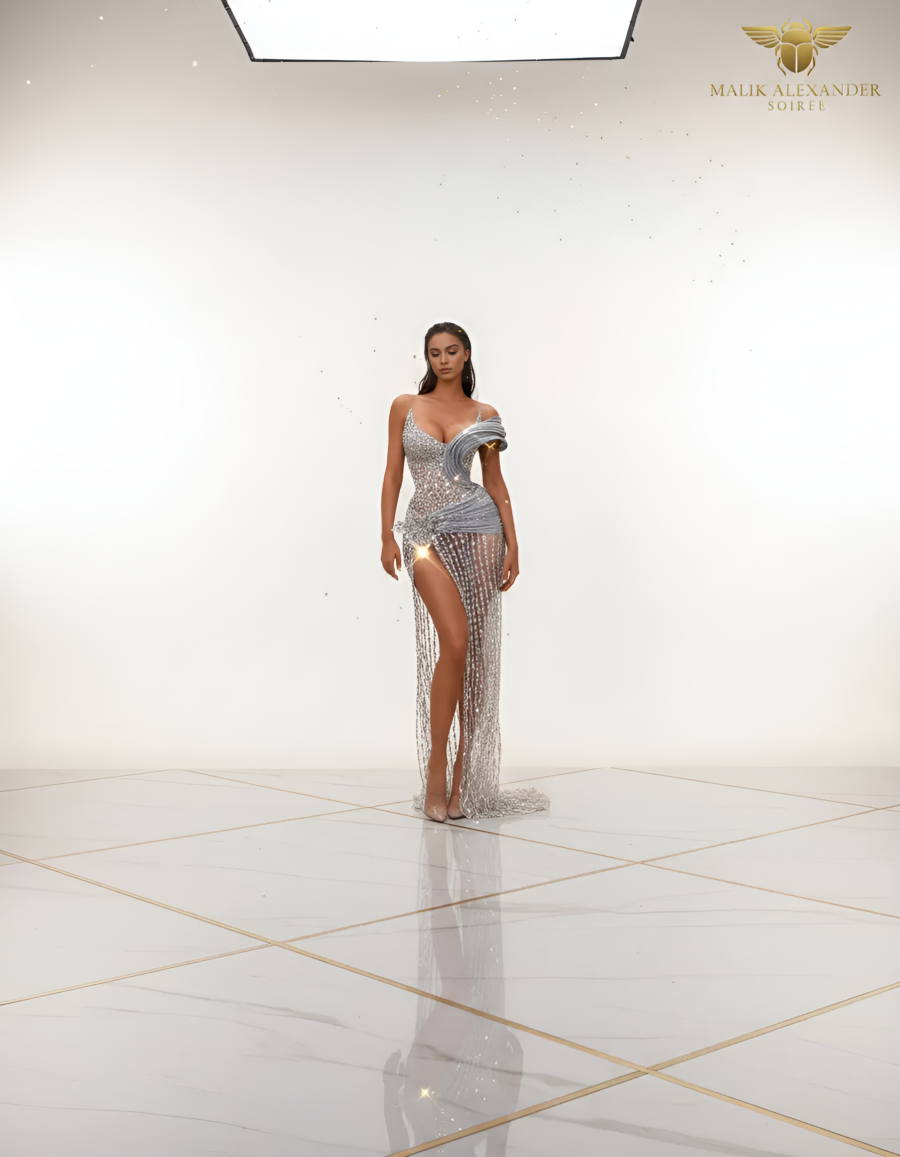 This is NOT a gown. This is a STATEMENT PIECE. The crystal chain fringe moves like a CHANDELIER swaying in the breeze — every step sends hundreds of crystal strands shimmering and swinging. The 3D tulle rosette at the shoulder adds couture drama, and that cutout midriff? BOLD. The shorter length makes this perfect for the woman who wants to DANCE. Because when you move in this, the fringe creates an absolute LIGHT SHOW.