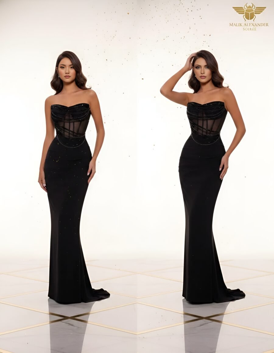 Black strapless mermaid gown with sweetheart neckline and sheer mesh corset bodice featuring visible boning creating a structured cage-like effect. The corset is partially transparent. Clean black body and mermaid skirt with subtle scattered crystal details.