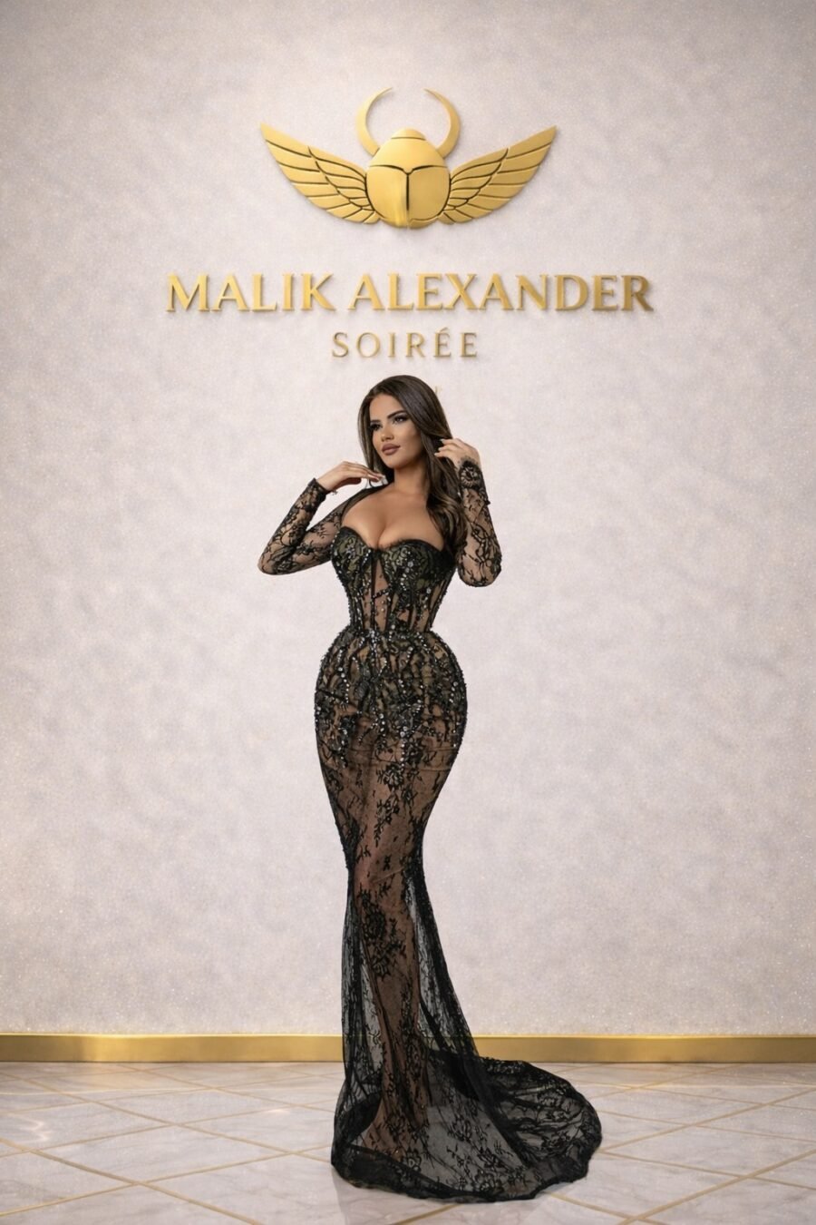 This is THAT dress. The one that makes every jaw in the room drop and every phone come out. The sheer black lace over skin is UNMATCHED — it’s seductive, powerful, and dripping with confidence. The crystal corset cinches you like royalty while the lace sleeves frame everything perfectly. When you walk in wearing this, nobody is looking at anyone else. NOBODY.