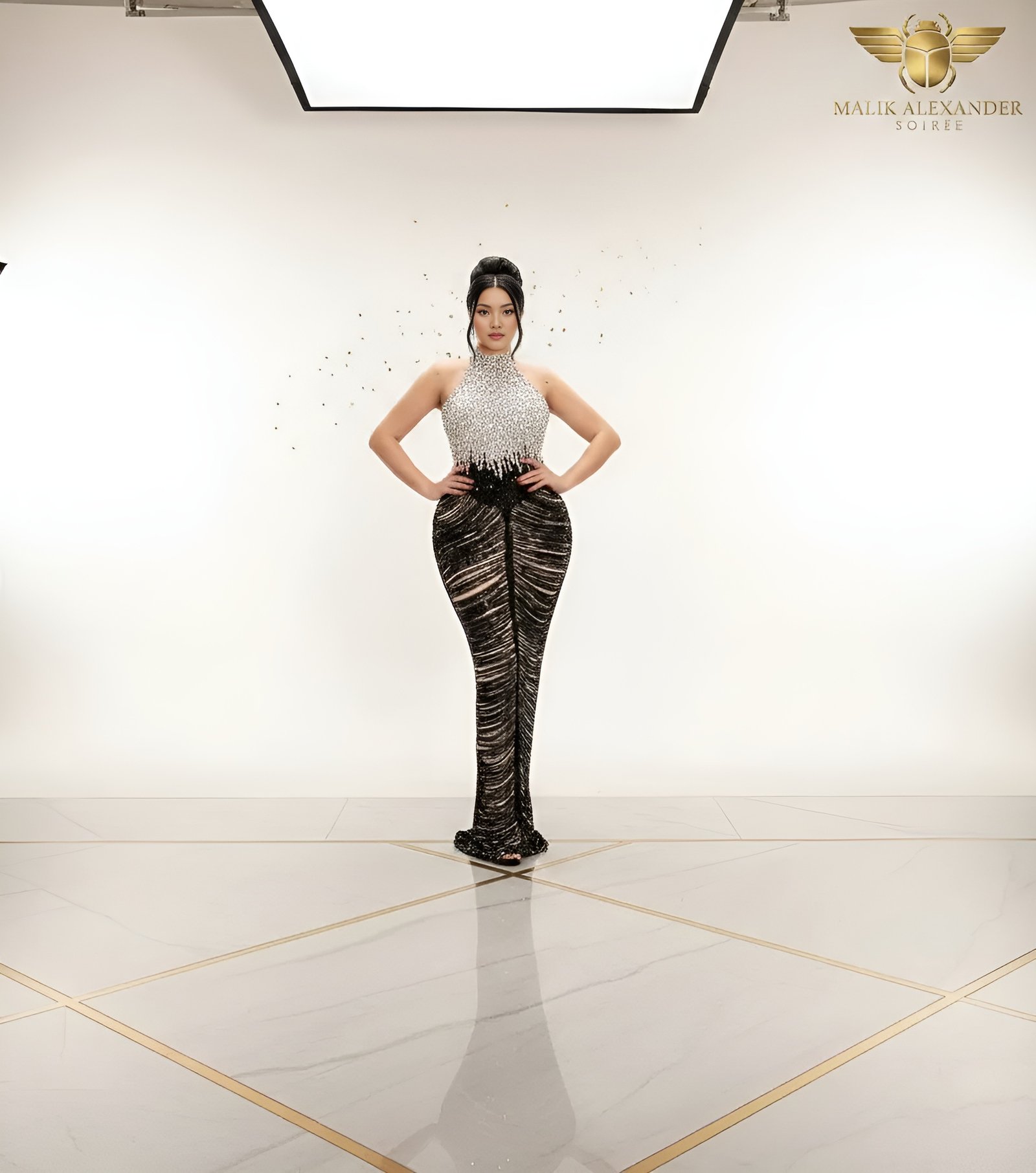 That SILVER PEARL BEADED HALTER is HEAVILY embellished — it’s LUXURY you can FEEL. The striped ruched skirt with sheer panels creates TEXTURE and INTRIGUE. This dress is OPULENT.