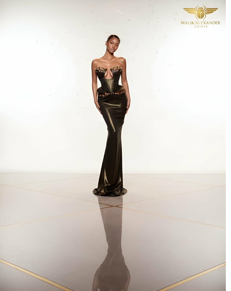 Black strapless corset mermaid with gold and bronze crystal.