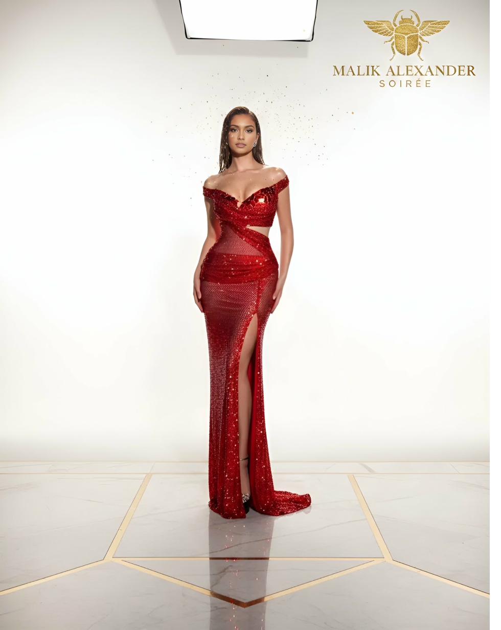 Red sequin off-shoulder gown with sheer waist panels and cutout.