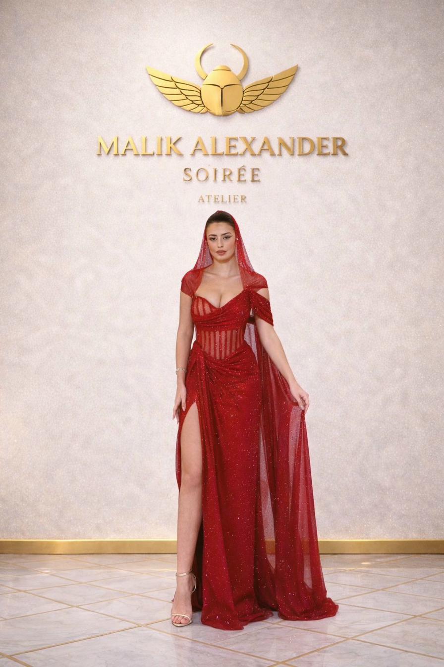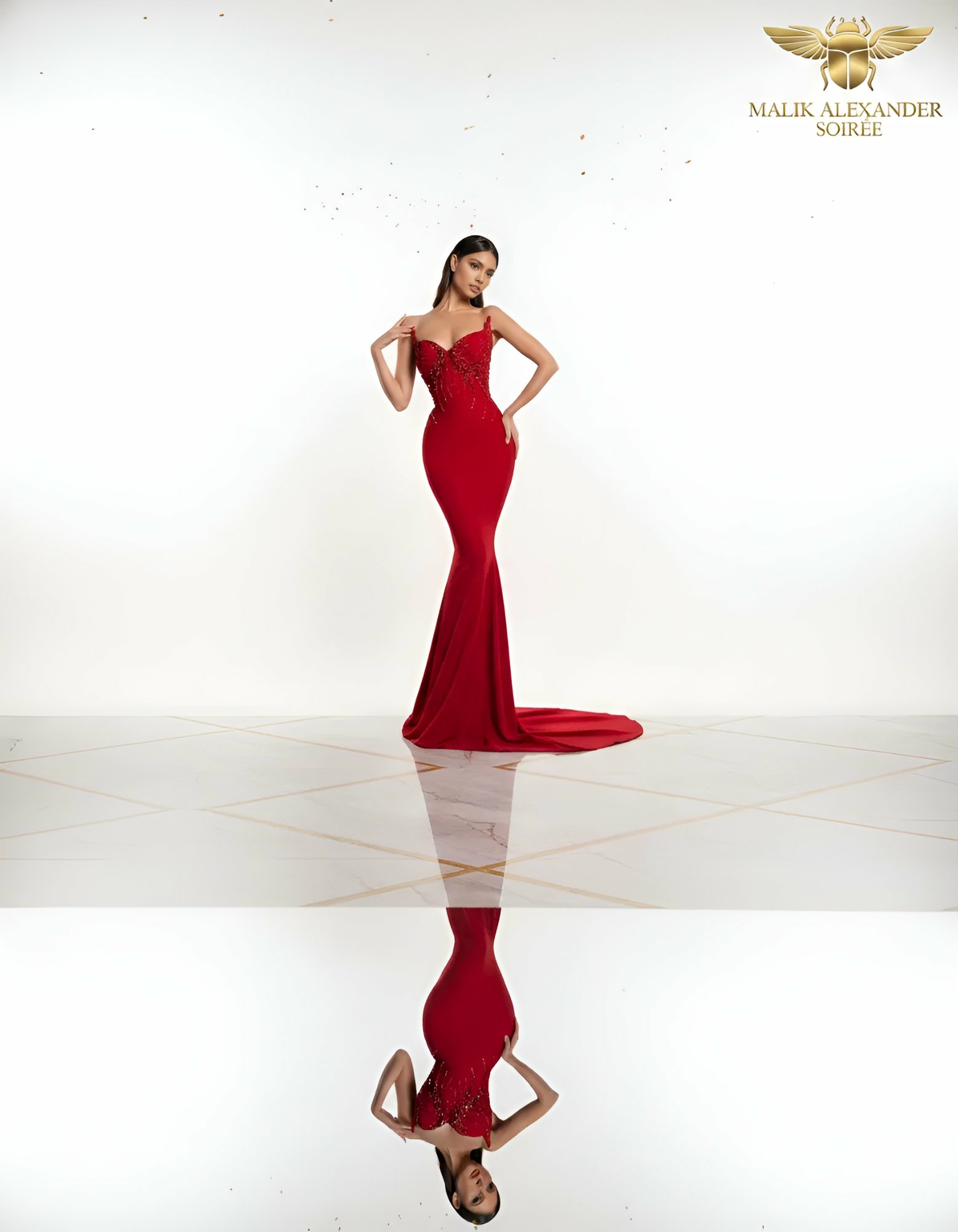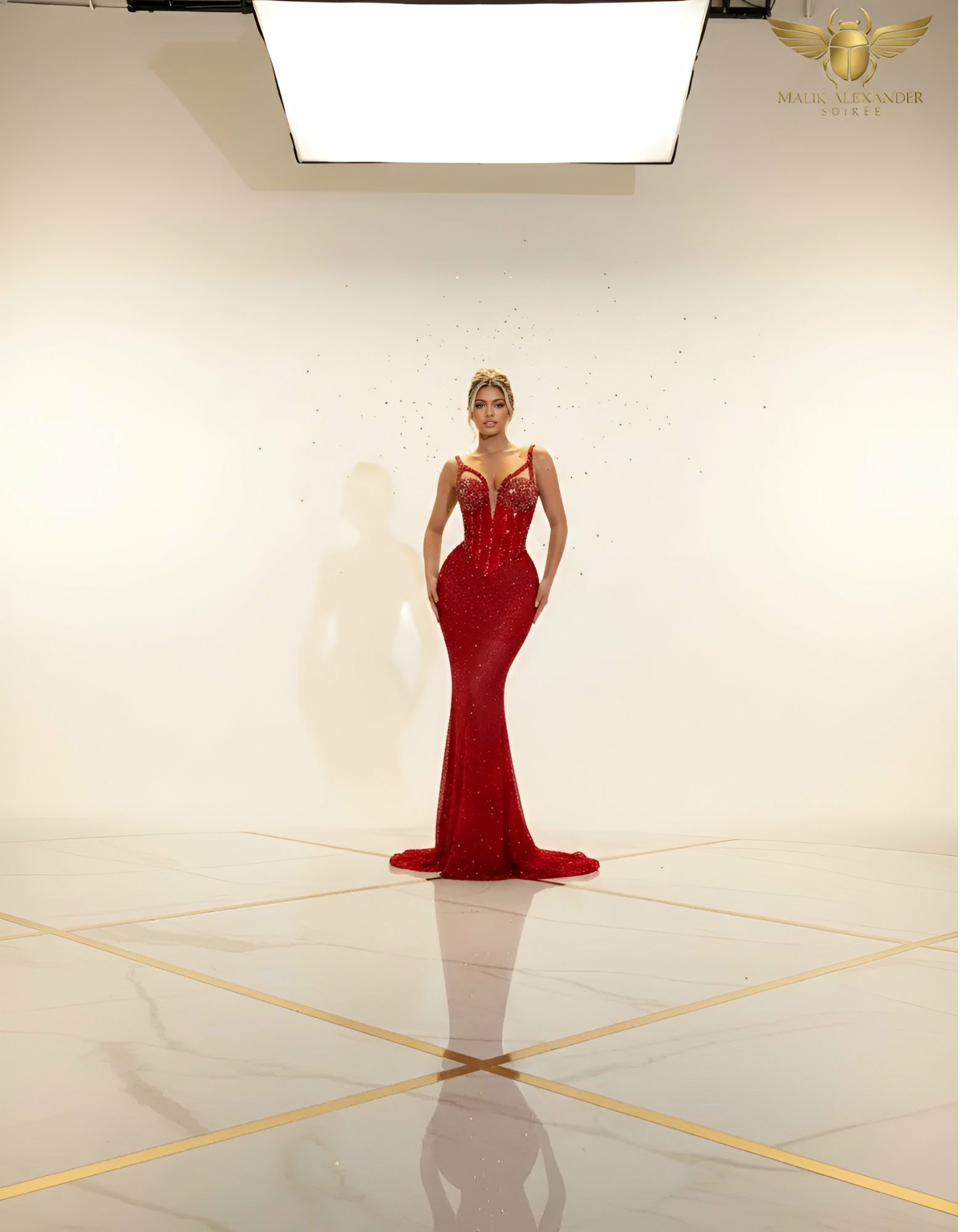 Red sequin V-neck mermaid with crystal-beaded corset bodice.