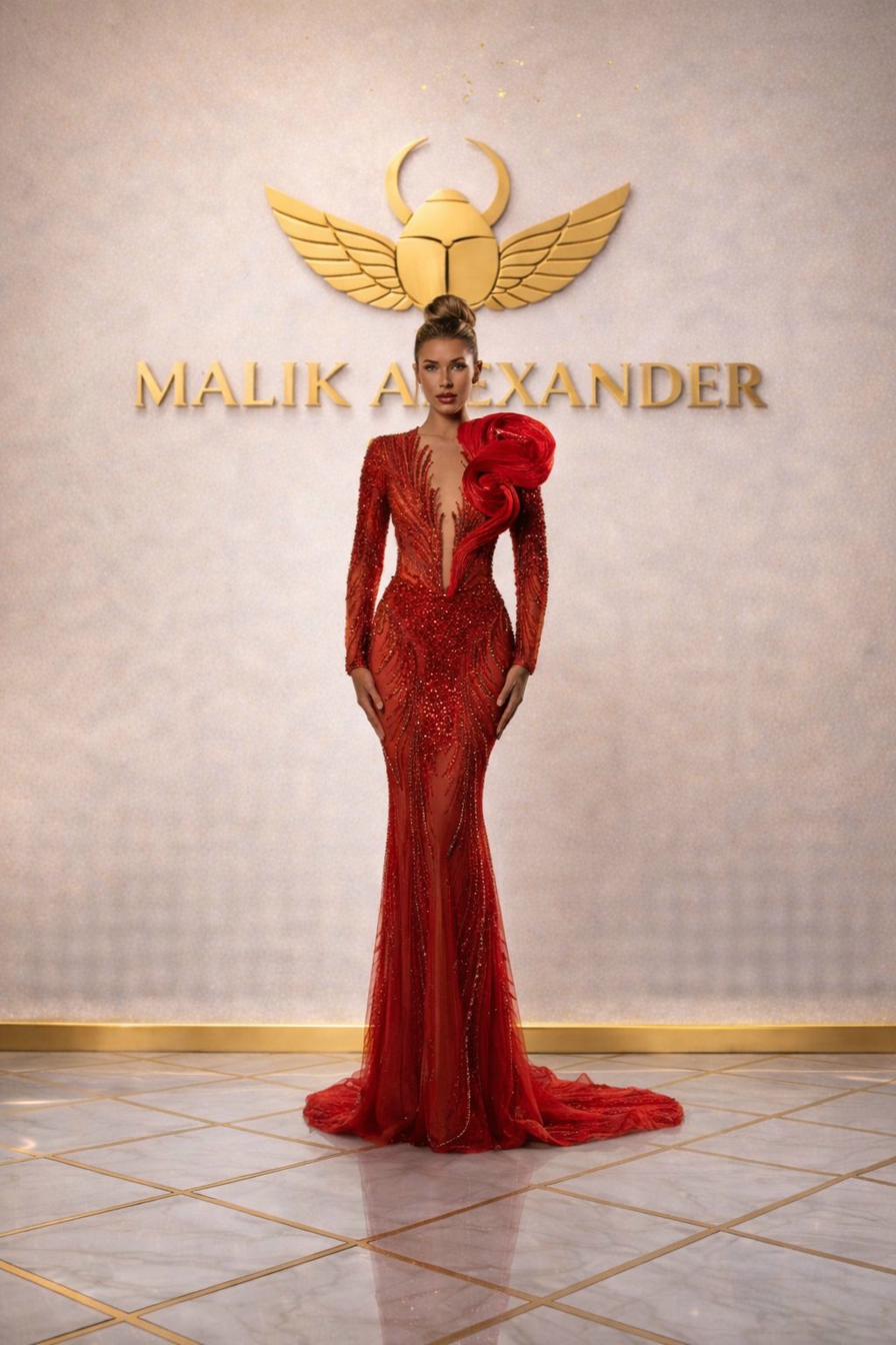 Red long-sleeve sheer mermaid with crystal feather beading.