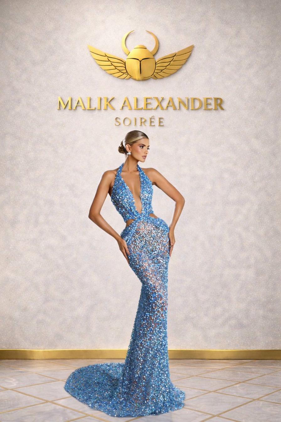 Cornflower blue halter mermaid with iridescent paillette sequins.