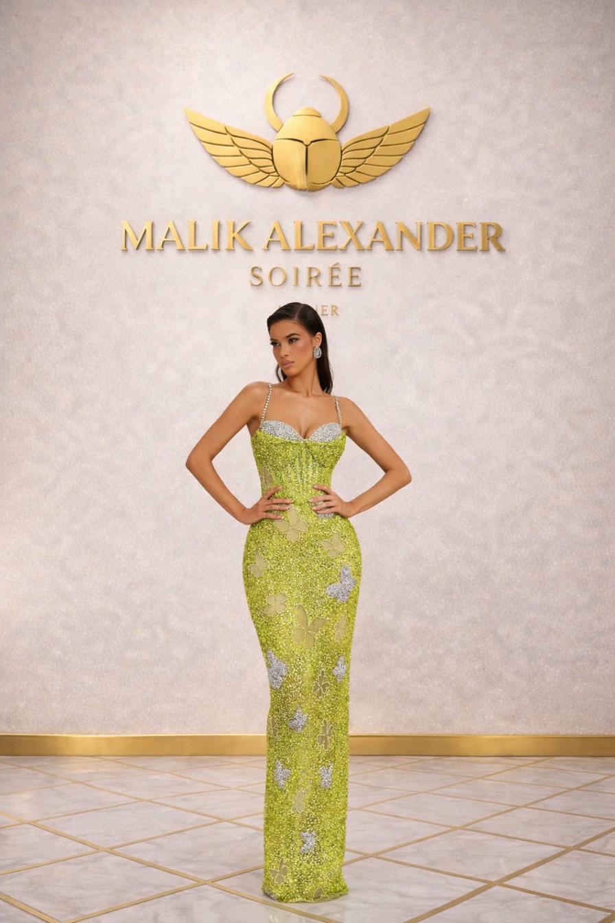 Lime chartreuse sequin gown with crystal bust and 3D butterflies.