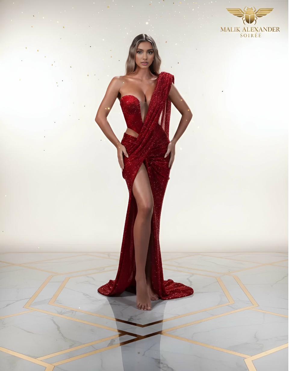 Red sequin one-shoulder draped gown with deep plunge and cutout waist detail. The Sparkle does exactly what the name promises — it catches every source of light in the room and multiplies it.
