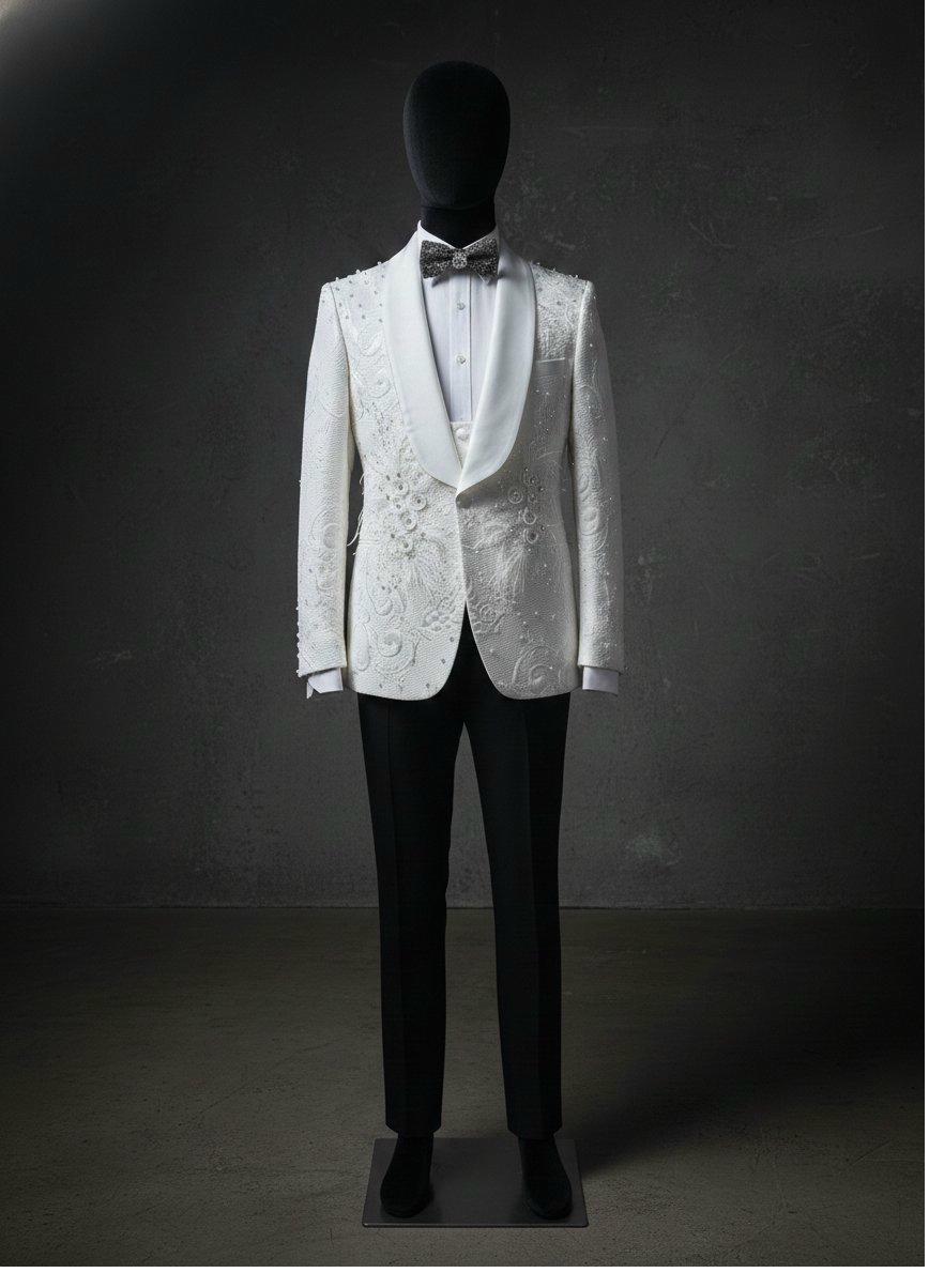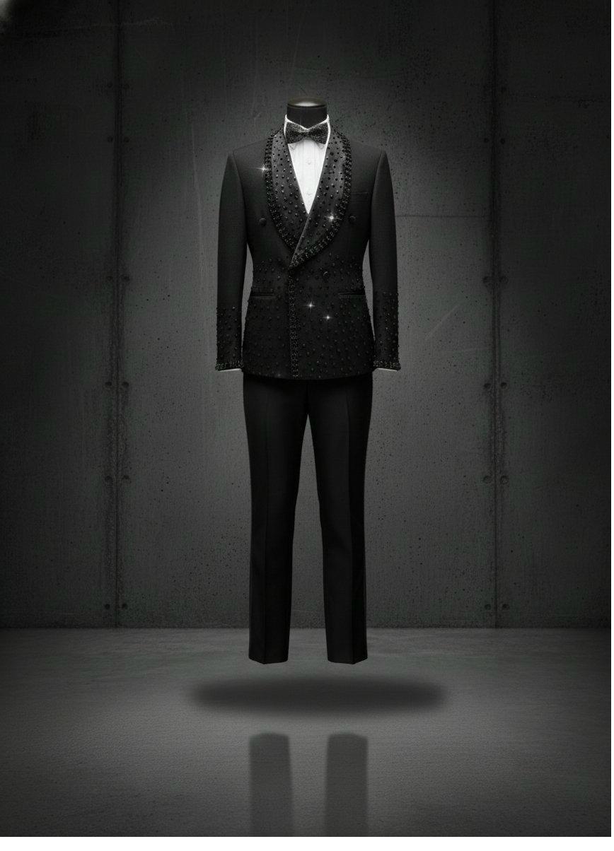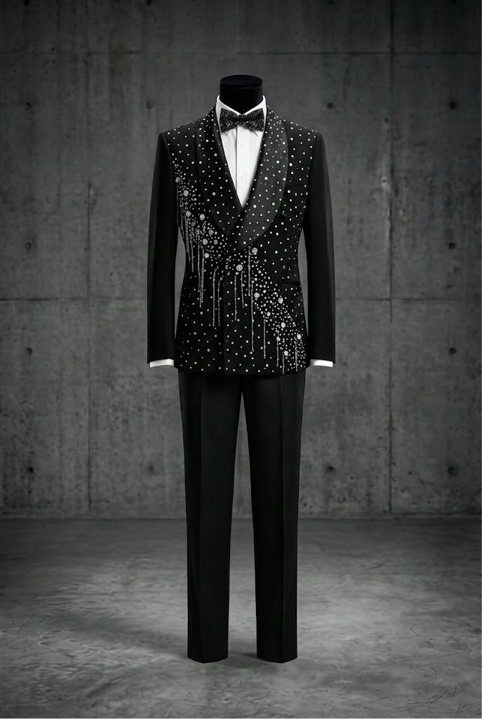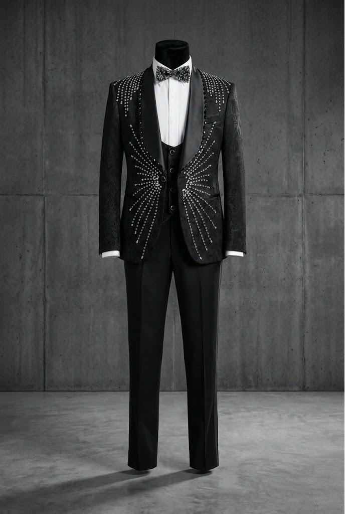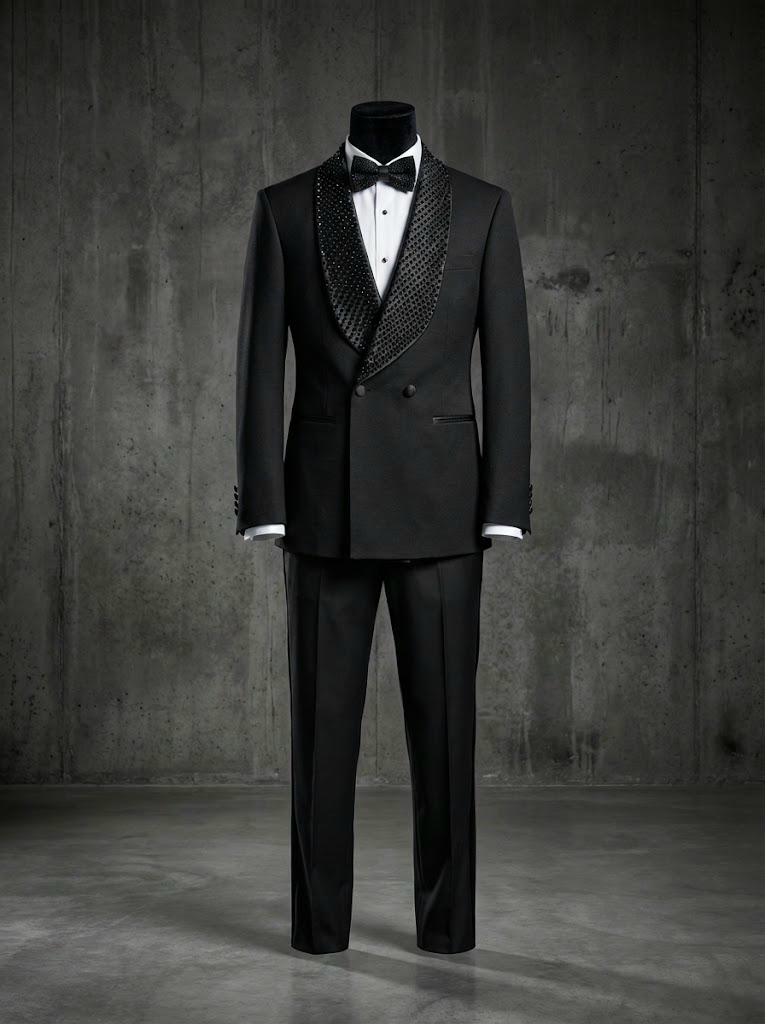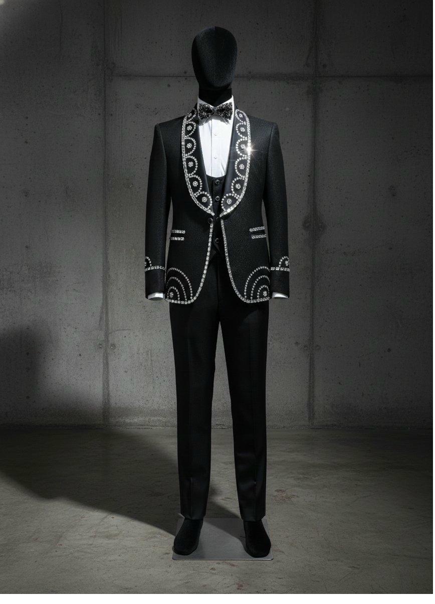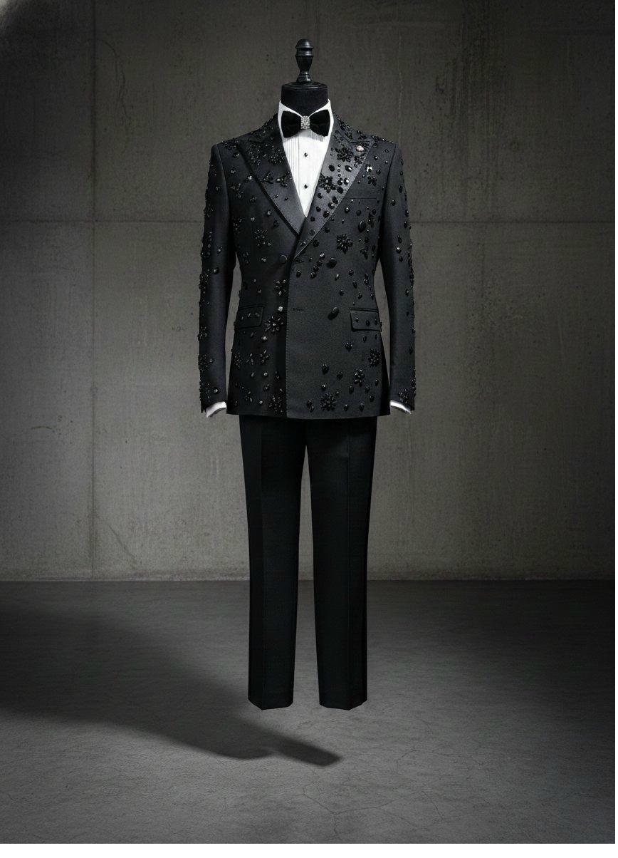 The Empire is where confidence meets crystal. These 55 tuxedos take the foundation of world-class tailoring and add the details that separate good from unforgettable — crystal lapels, beaded patterns, textured fabrics that catch every light in the room. He doesn't just show up. He takes over.