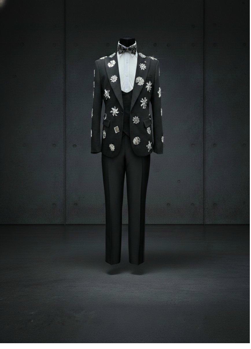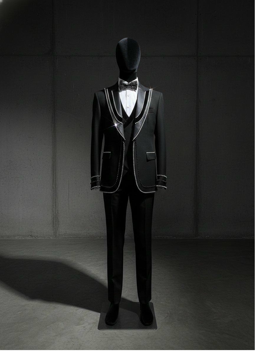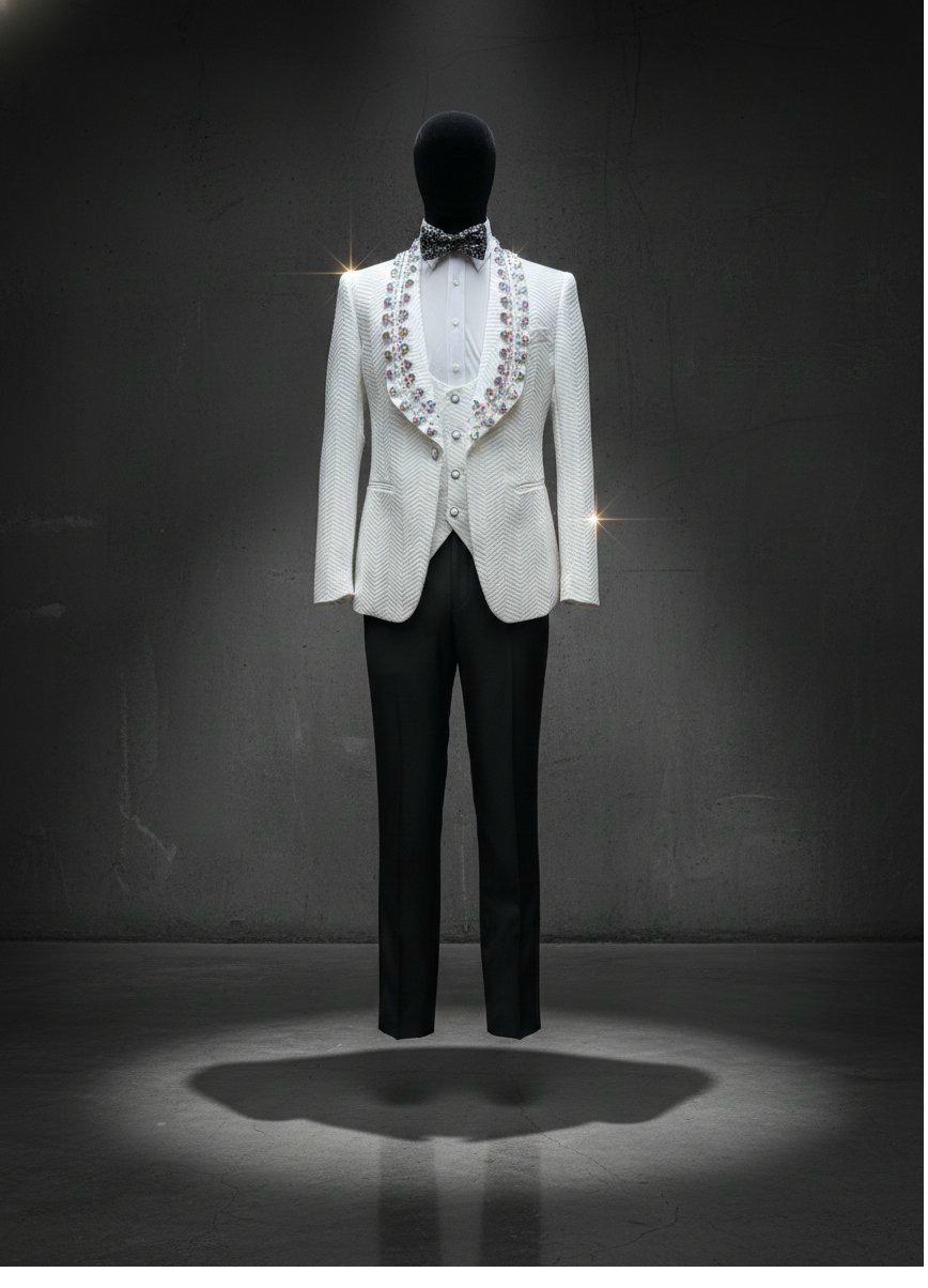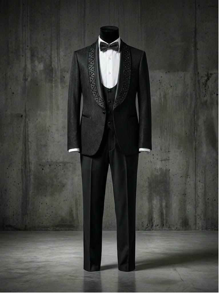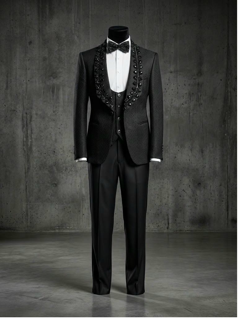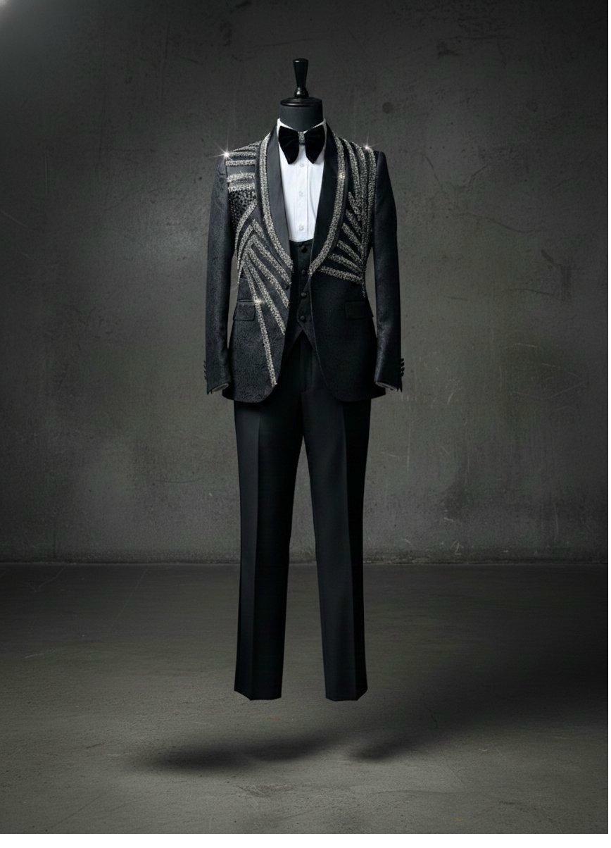 The Empire is where confidence meets crystal. These 55 tuxedos take the foundation of world-class tailoring and add the details that separate good from unforgettable — crystal lapels, beaded patterns, textured fabrics that catch every light in the room. He doesn't just show up. He takes over.
