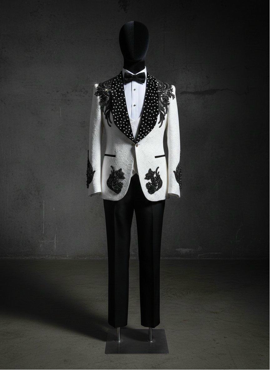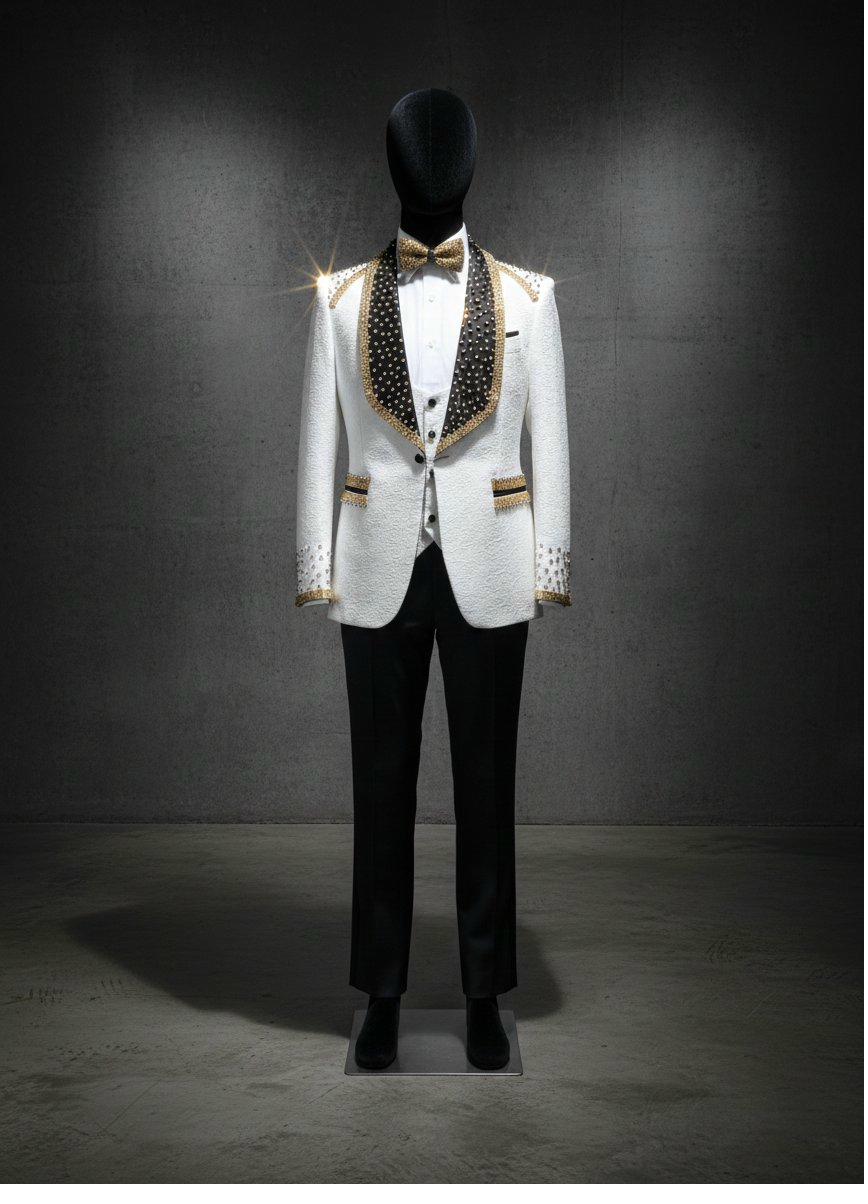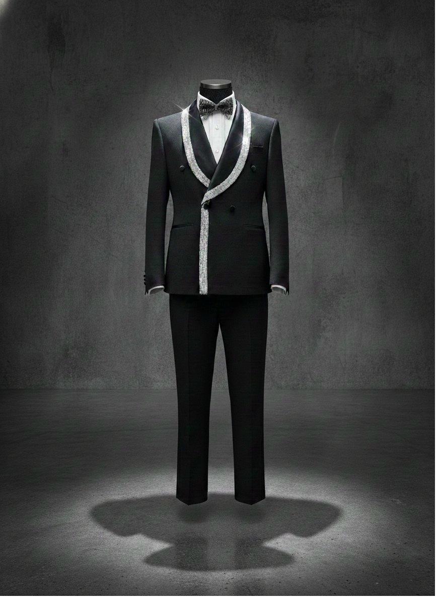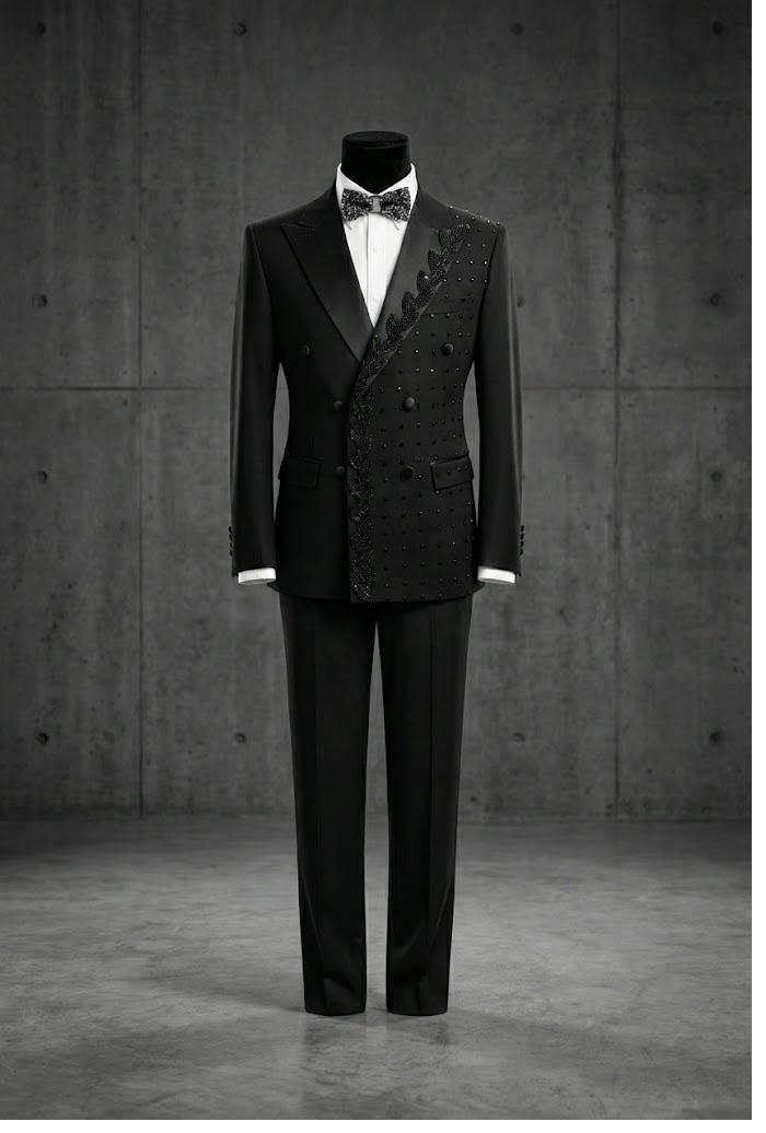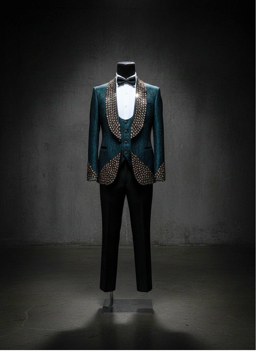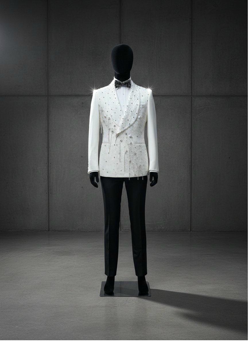 The Empire is where confidence meets crystal. These 55 tuxedos take the foundation of world-class tailoring and add the details that separate good from unforgettable — crystal lapels, beaded patterns, textured fabrics that catch every light in the room. He doesn't just show up. He takes over.