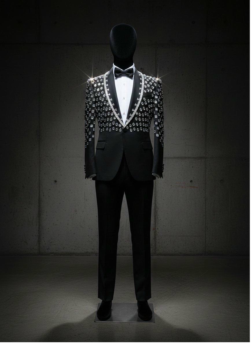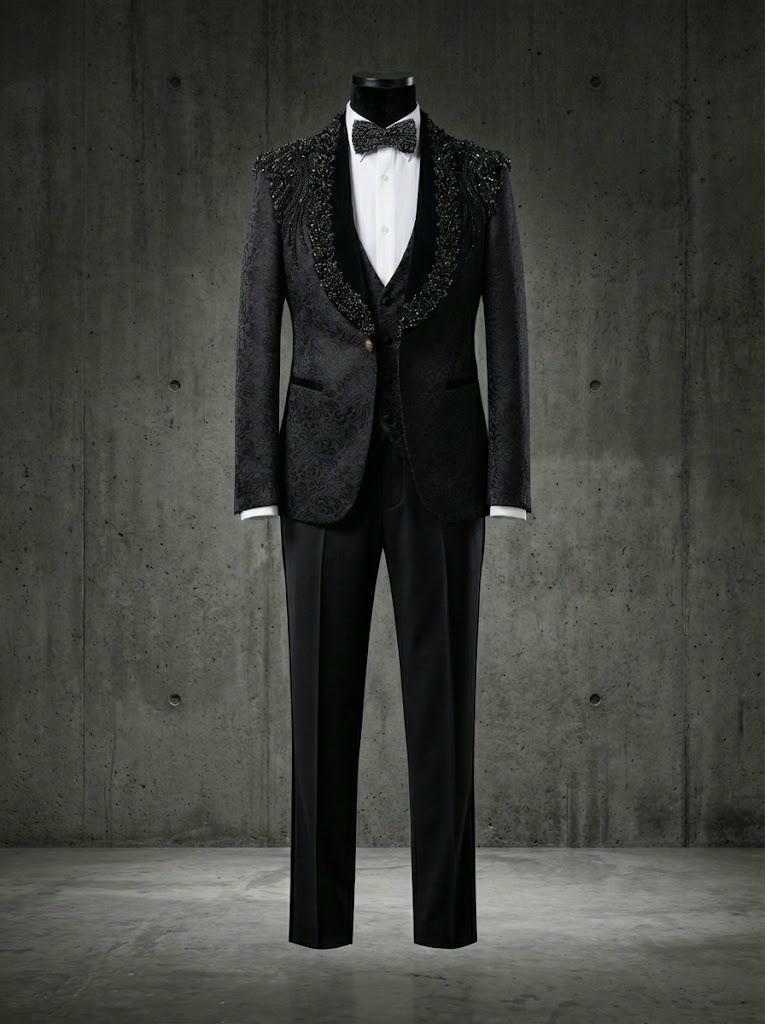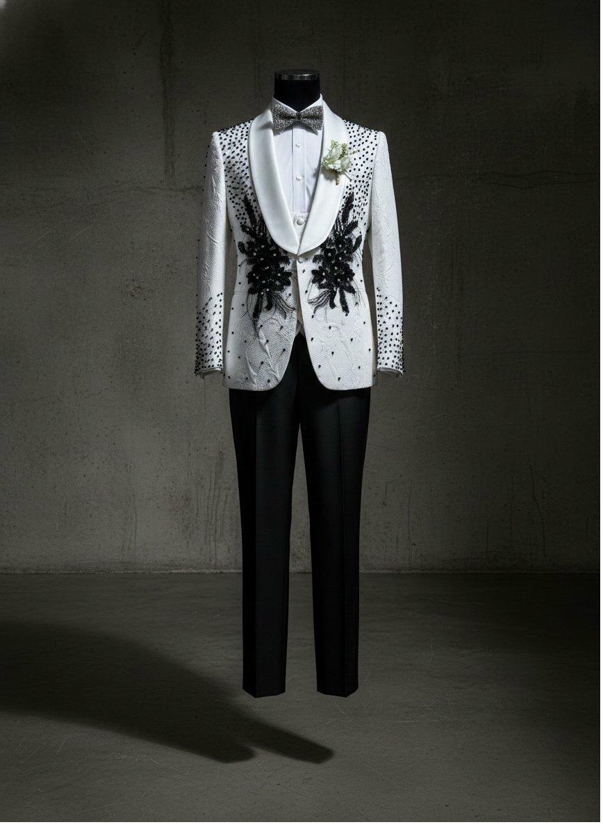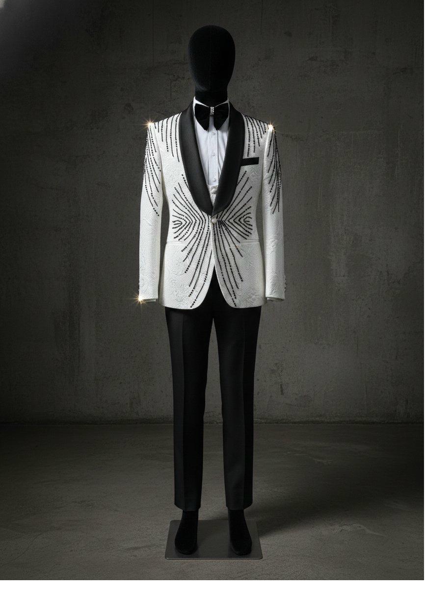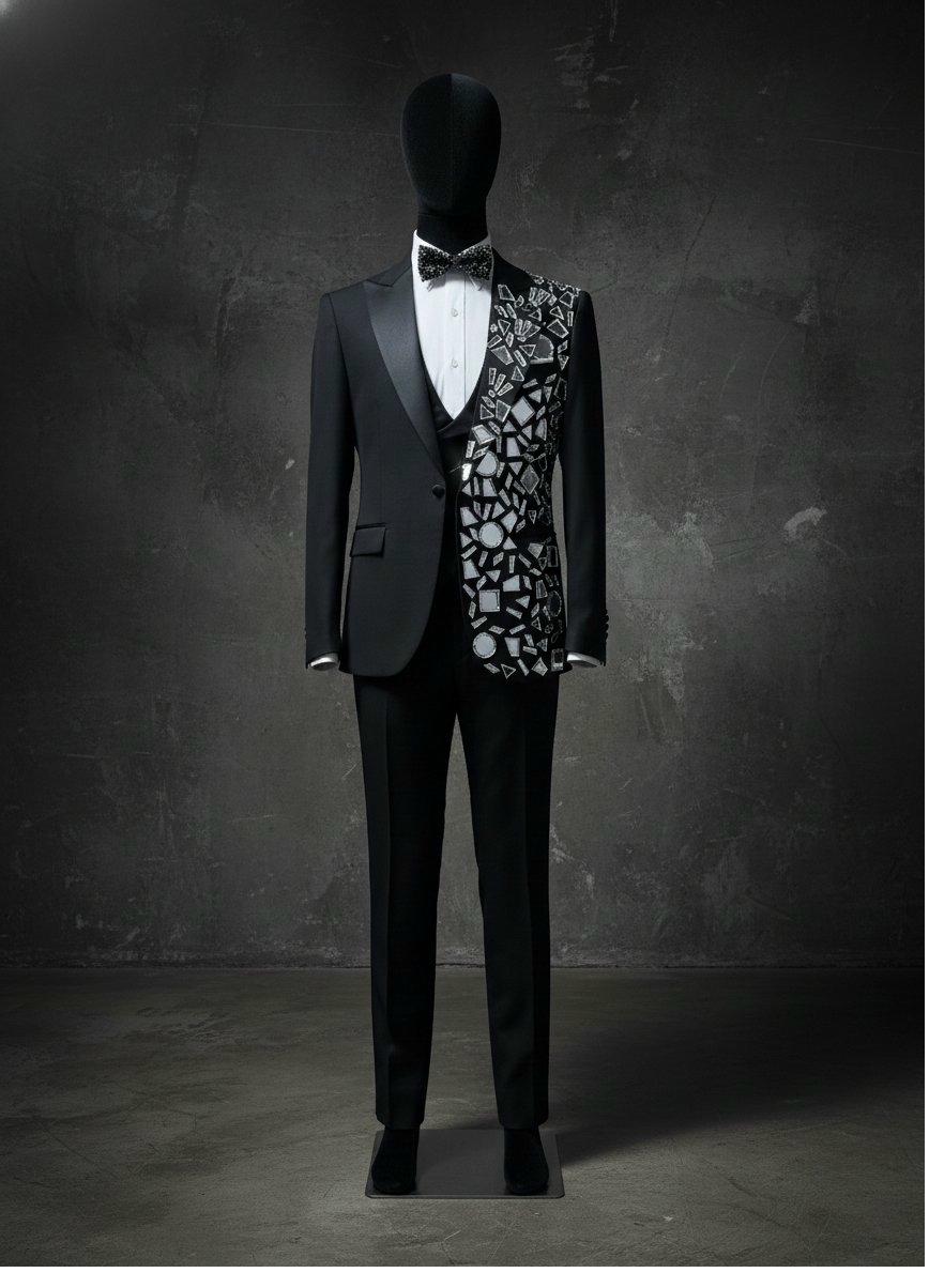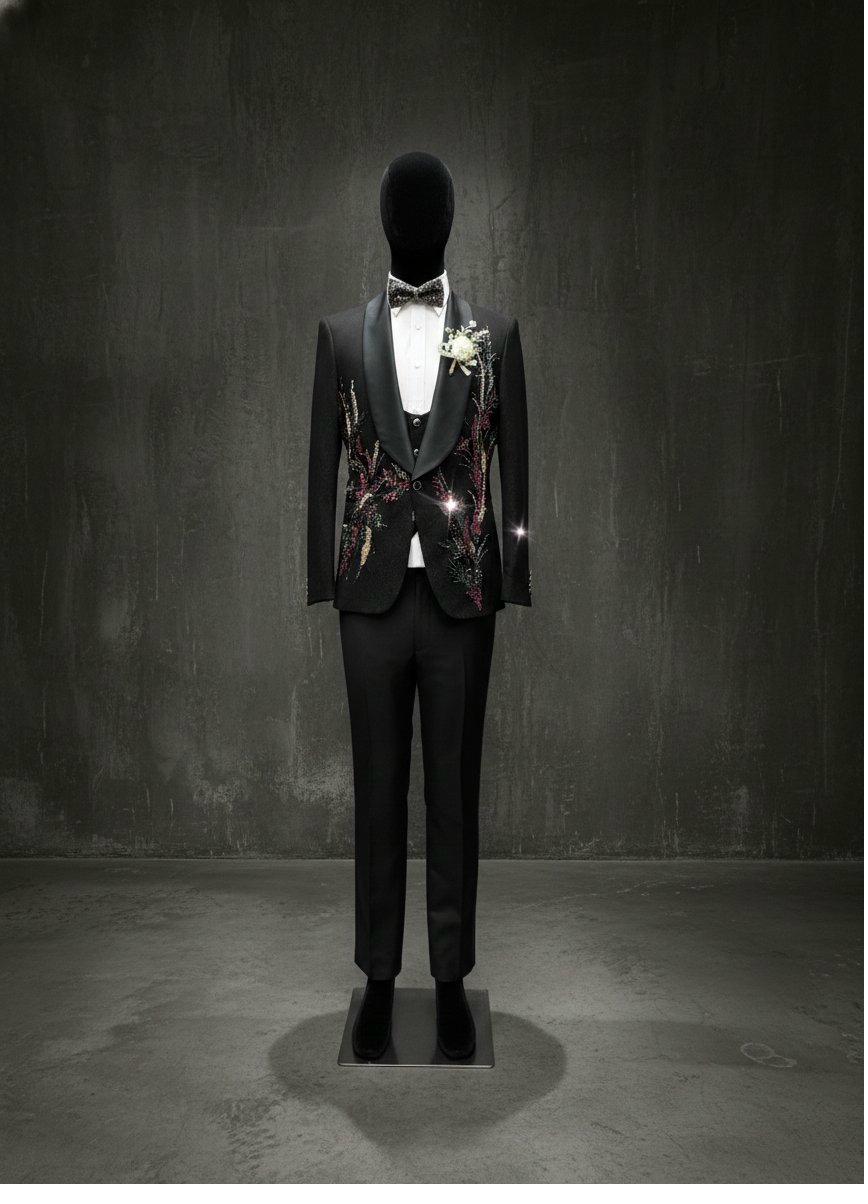 The Empire is where confidence meets crystal. These 55 tuxedos take the foundation of world-class tailoring and add the details that separate good from unforgettable — crystal lapels, beaded patterns, textured fabrics that catch every light in the room. He doesn't just show up. He takes over.