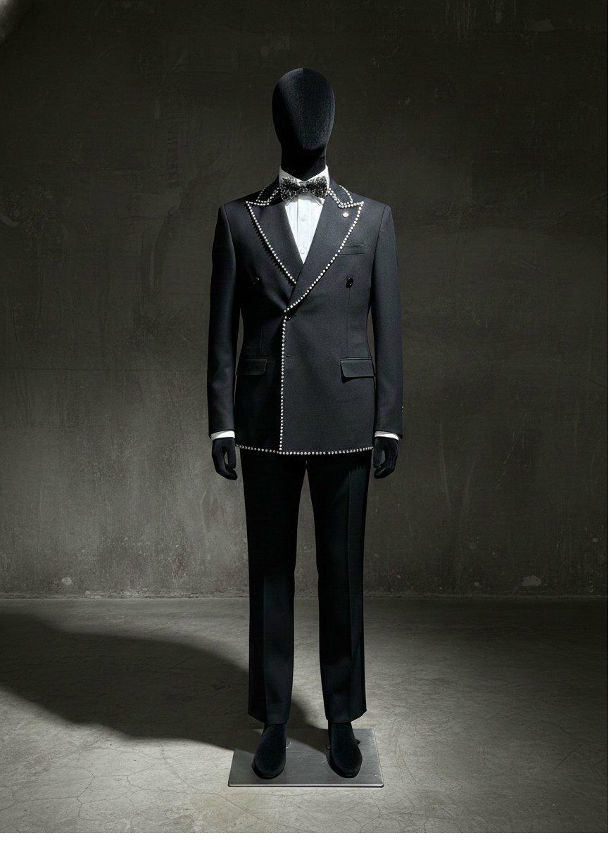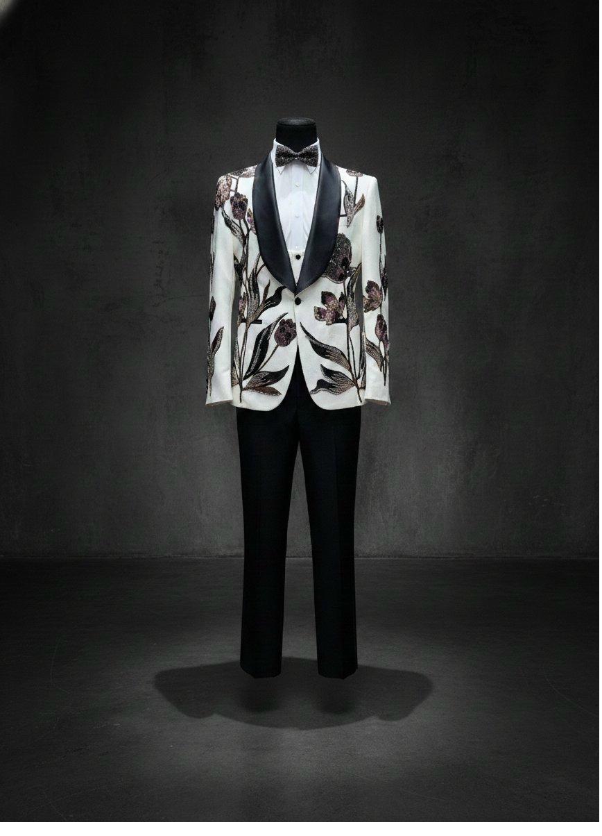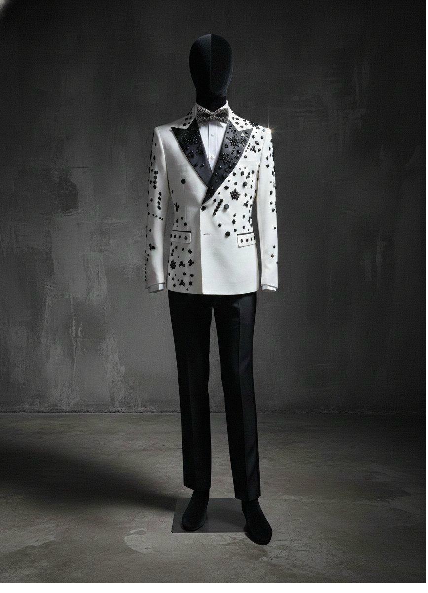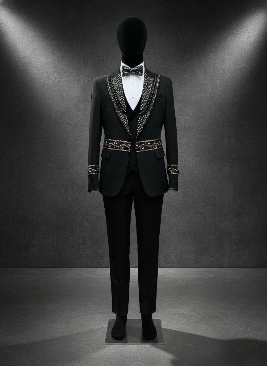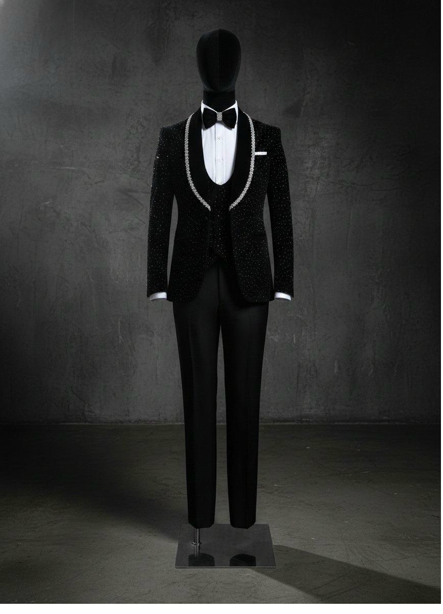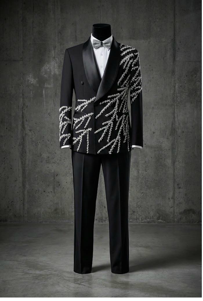 The Empire is where confidence meets crystal. These 55 tuxedos take the foundation of world-class tailoring and add the details that separate good from unforgettable — crystal lapels, beaded patterns, textured fabrics that catch every light in the room. He doesn't just show up. He takes over.