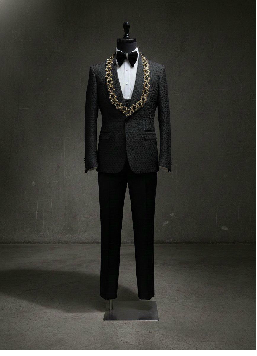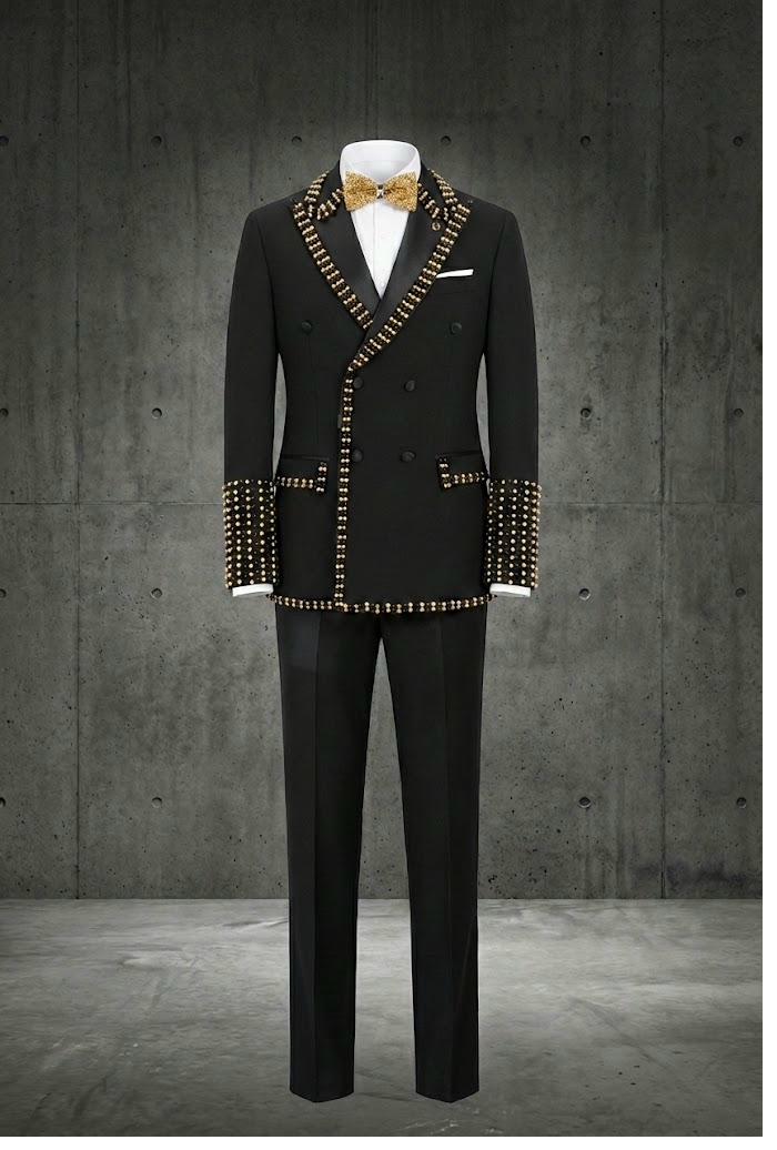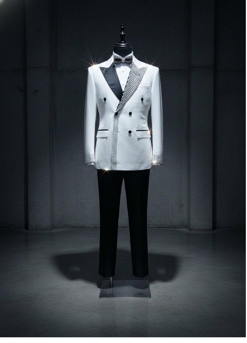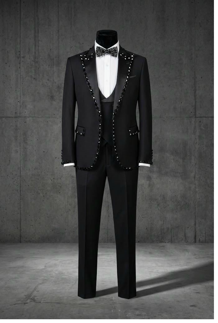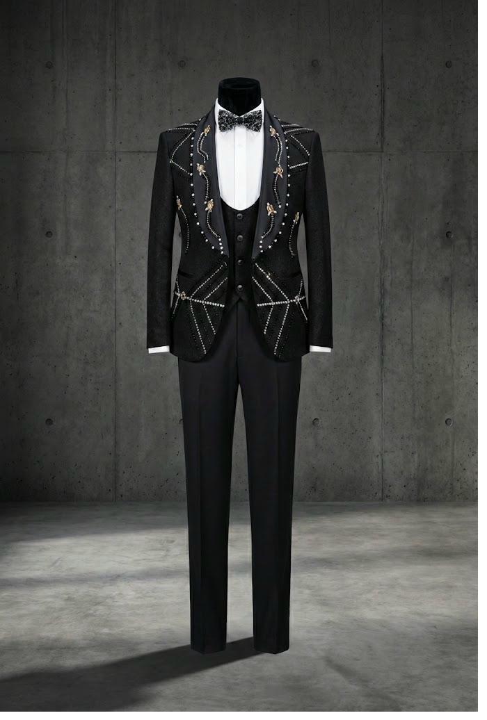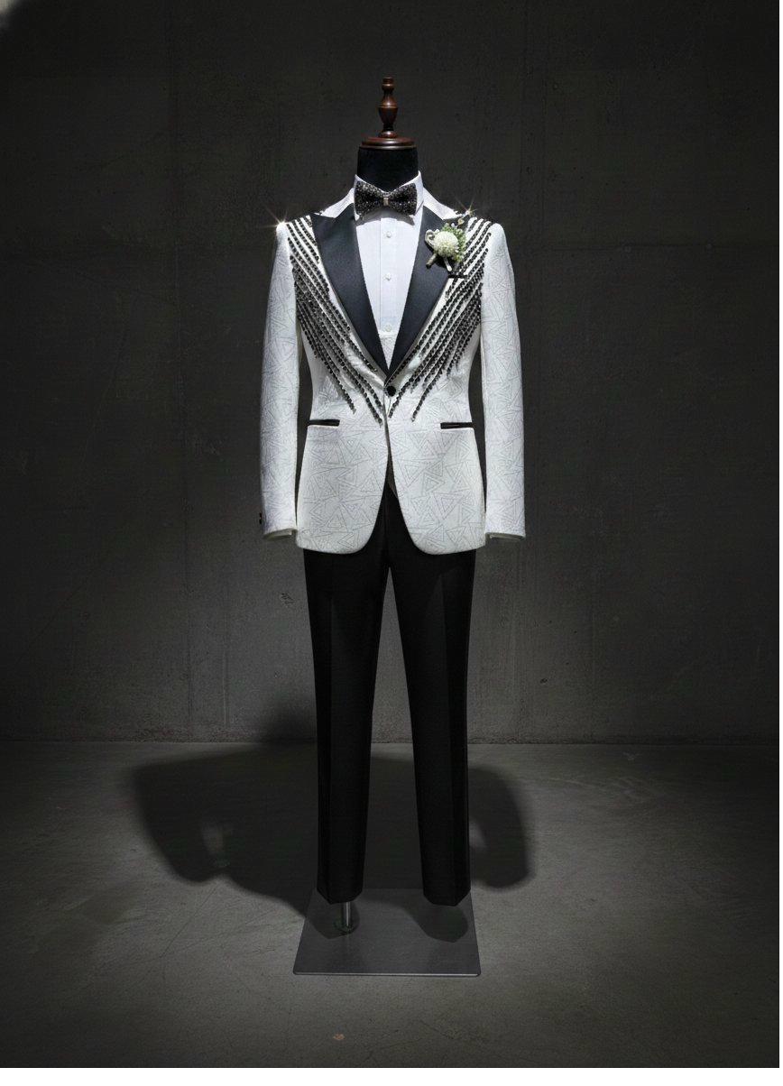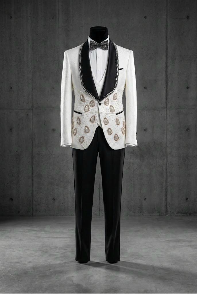 The Empire is where confidence meets crystal. These 55 tuxedos take the foundation of world-class tailoring and add the details that separate good from unforgettable — crystal lapels, beaded patterns, textured fabrics that catch every light in the room. He doesn't just show up. He takes over.