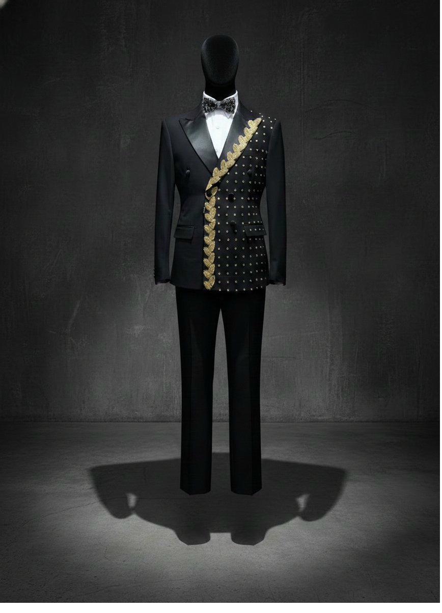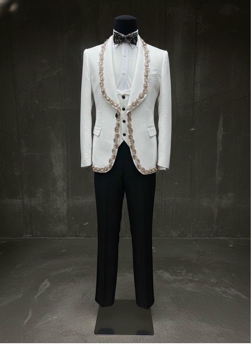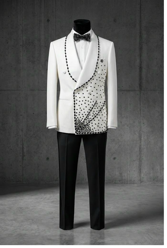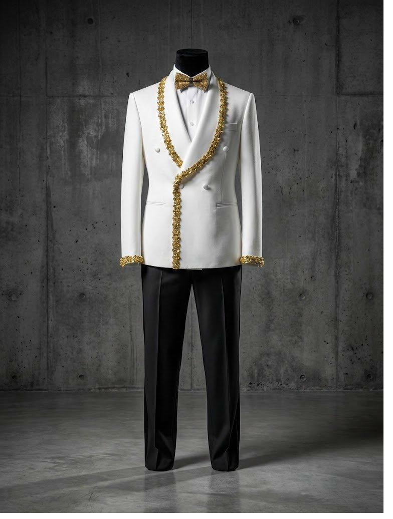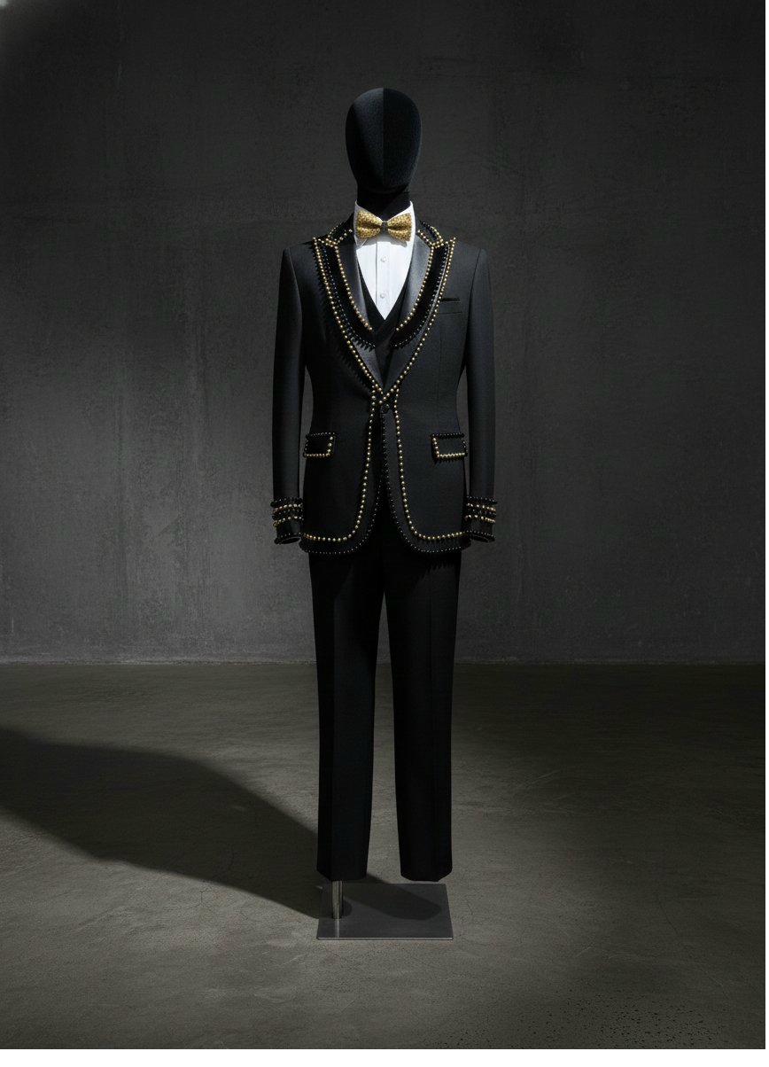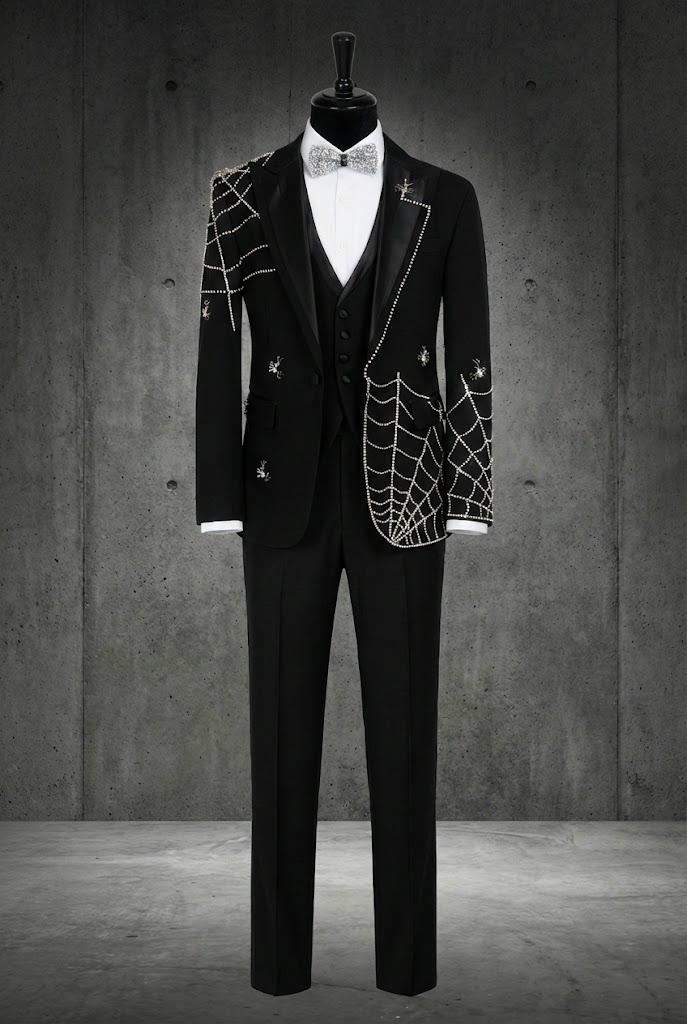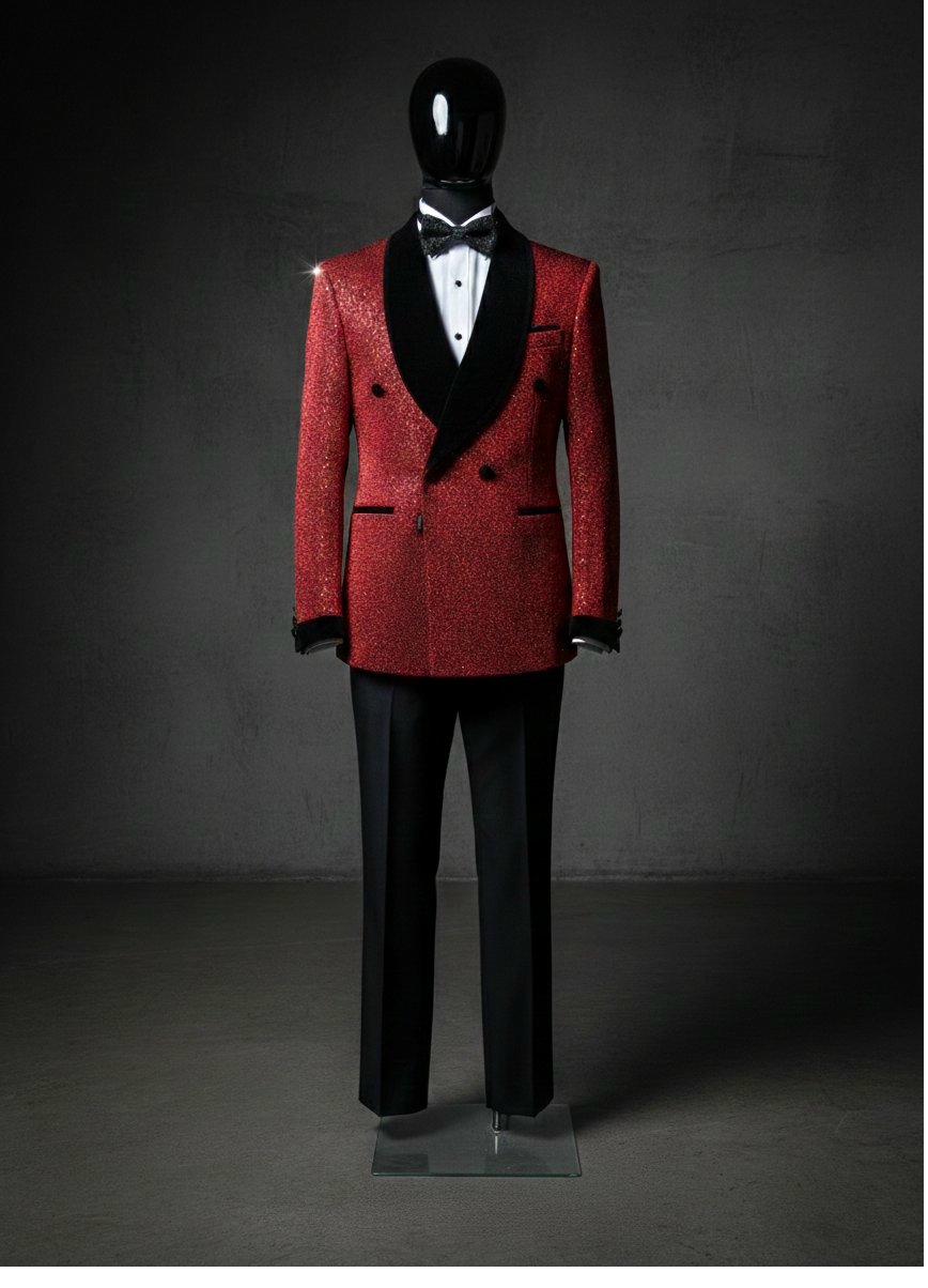 The Empire is where confidence meets crystal. These 55 tuxedos take the foundation of world-class tailoring and add the details that separate good from unforgettable — crystal lapels, beaded patterns, textured fabrics that catch every light in the room. He doesn't just show up. He takes over.