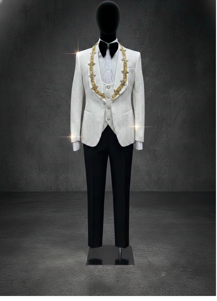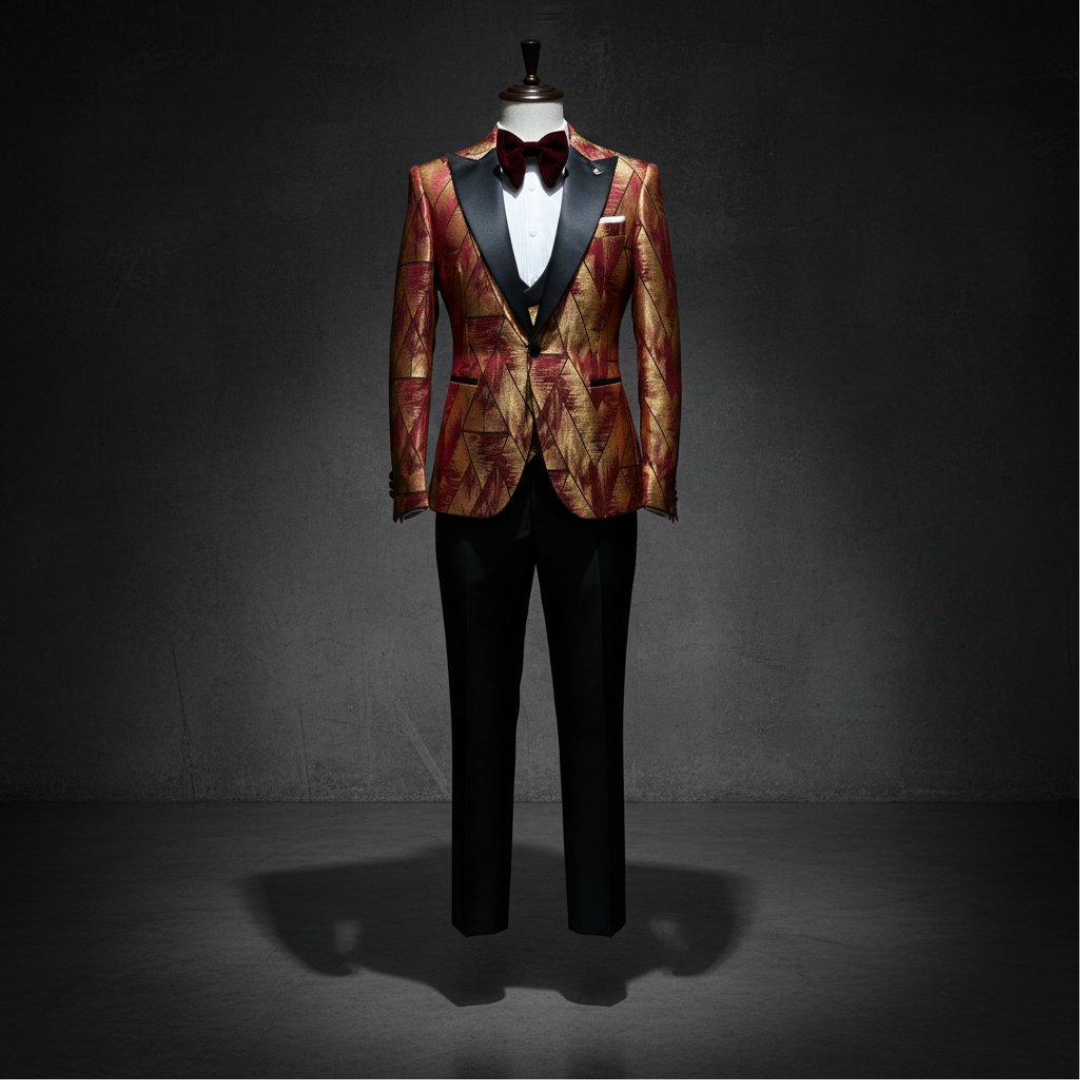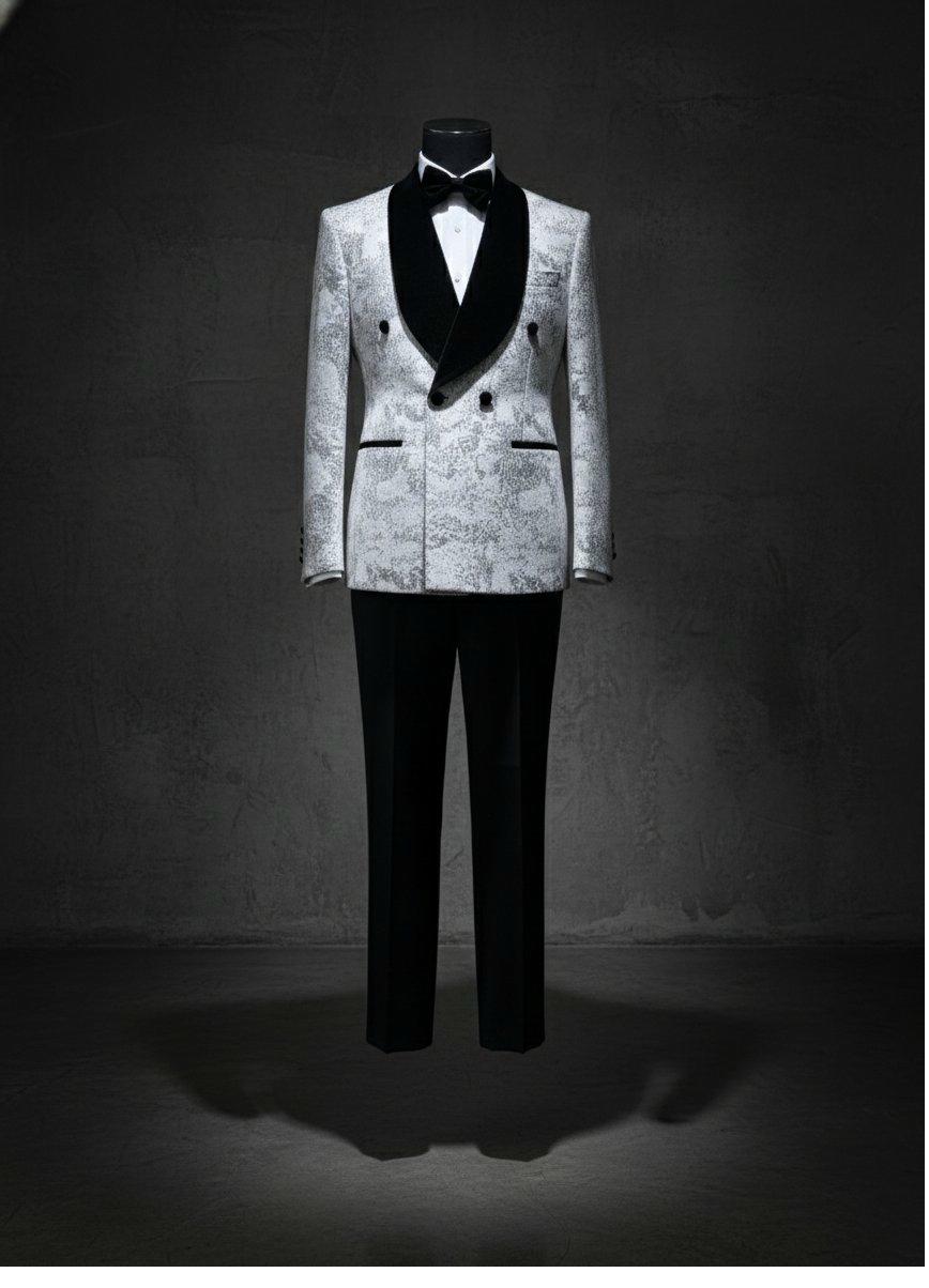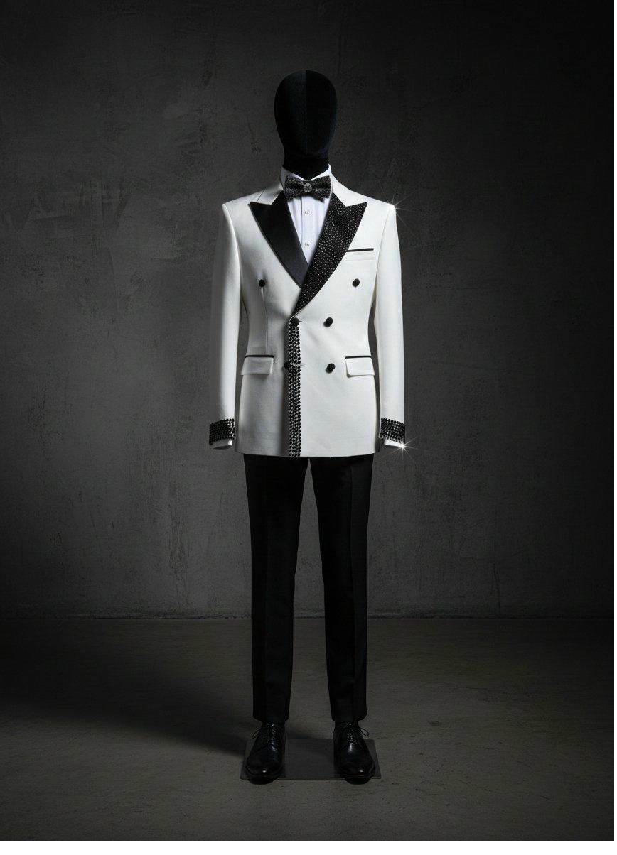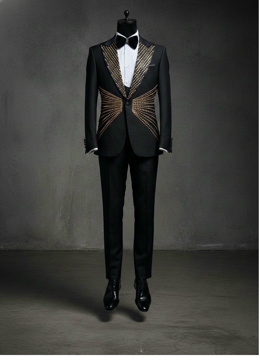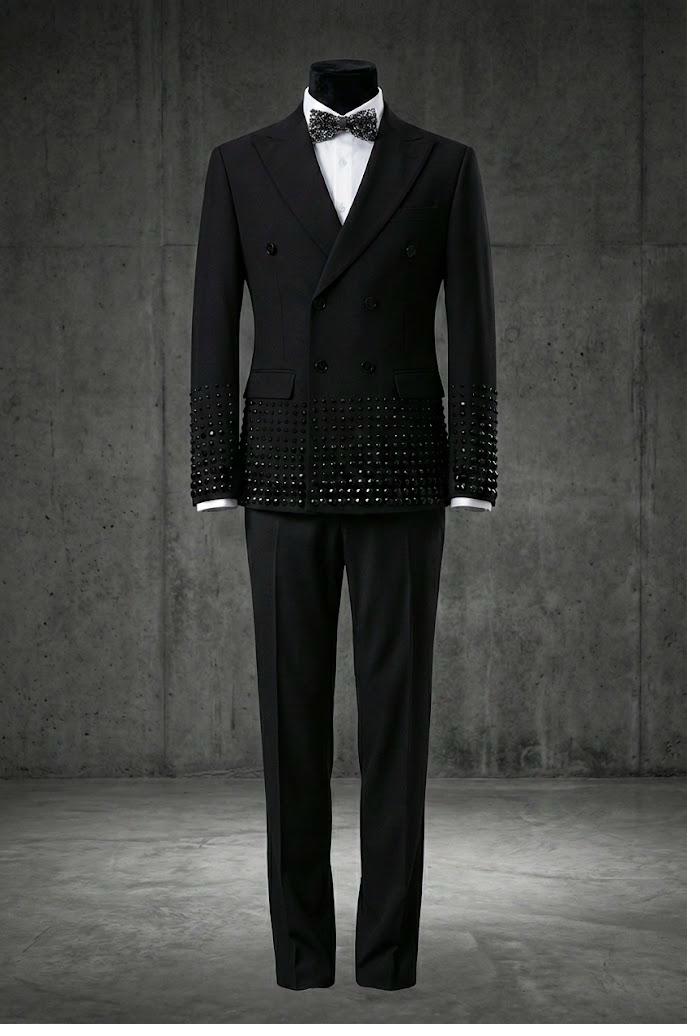The Empire is where confidence meets crystal. These 55 tuxedos take the foundation of world-class tailoring and add the details that separate good from unforgettable — crystal lapels, beaded patterns, textured fabrics that catch every light in the room. He doesn't just show up. He takes over.