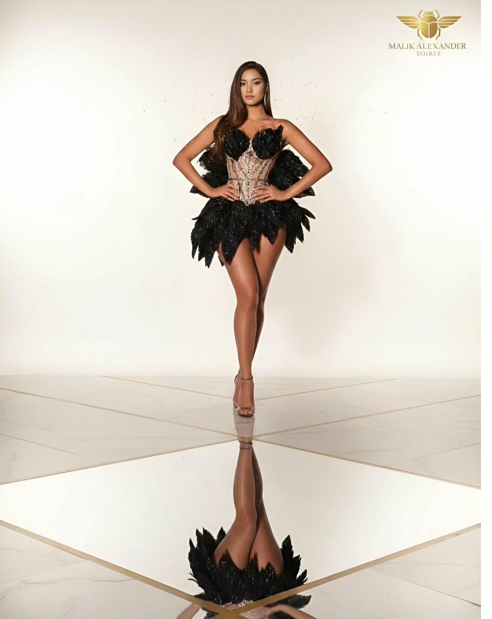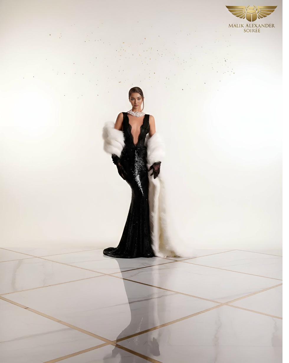 Black gown with crystal feathered wing shoulders and deep plunge.