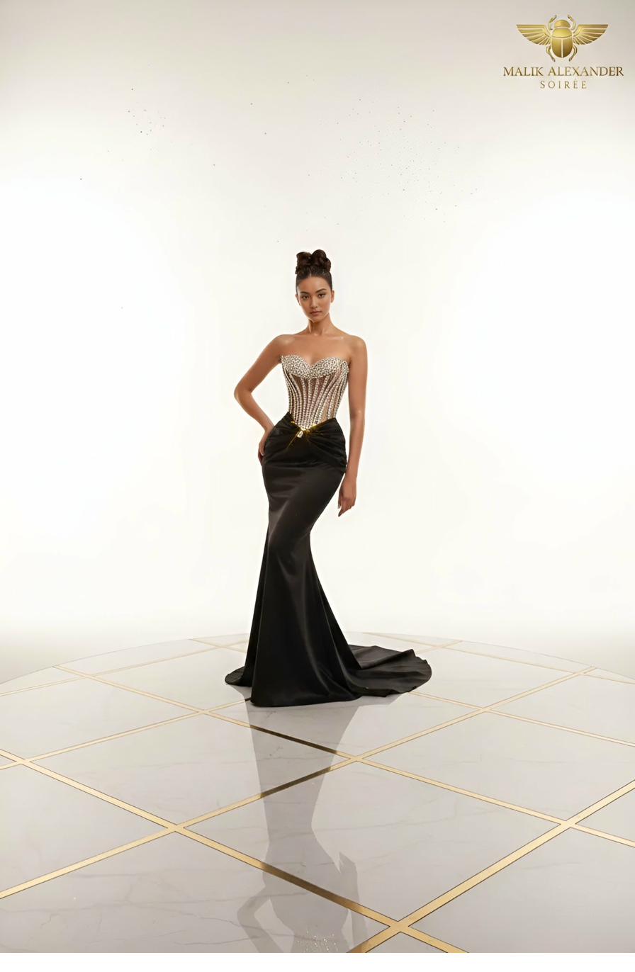 Crystal and pearl-encrusted corset bodice with black satin mermaid.