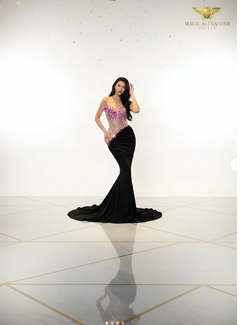 Black mermaid with pink/magenta crystal gradient corset.