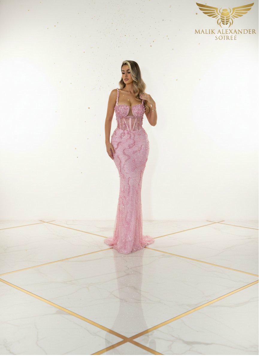 Pink corset mermaid with 3D floral bust, crystal straps, and elaborate construction. The pink garden brings the outdoors into formal wear — the 3D floral bust creates a centerpiece of botanical luxury.